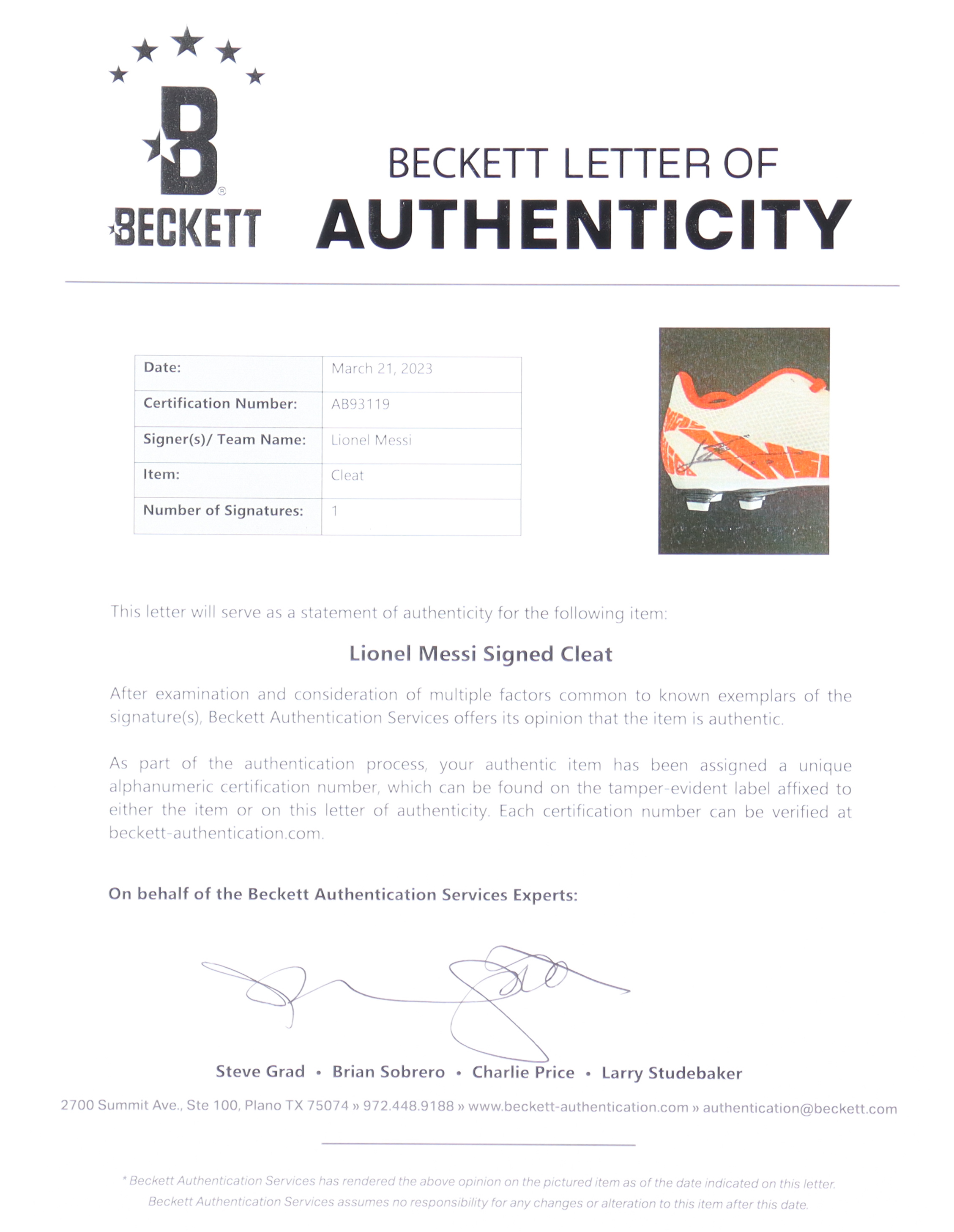 The autograph includes an official Beckett Authentication Services hologram and matching LOA for authenticity purposes.