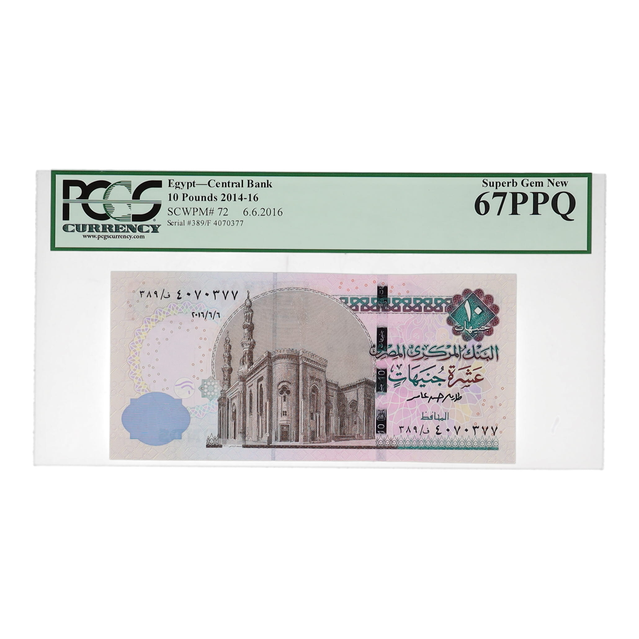 2014-16 Egypt Central Bank £10 (PCGS SUPERB GEM NEW 67 PPQ)