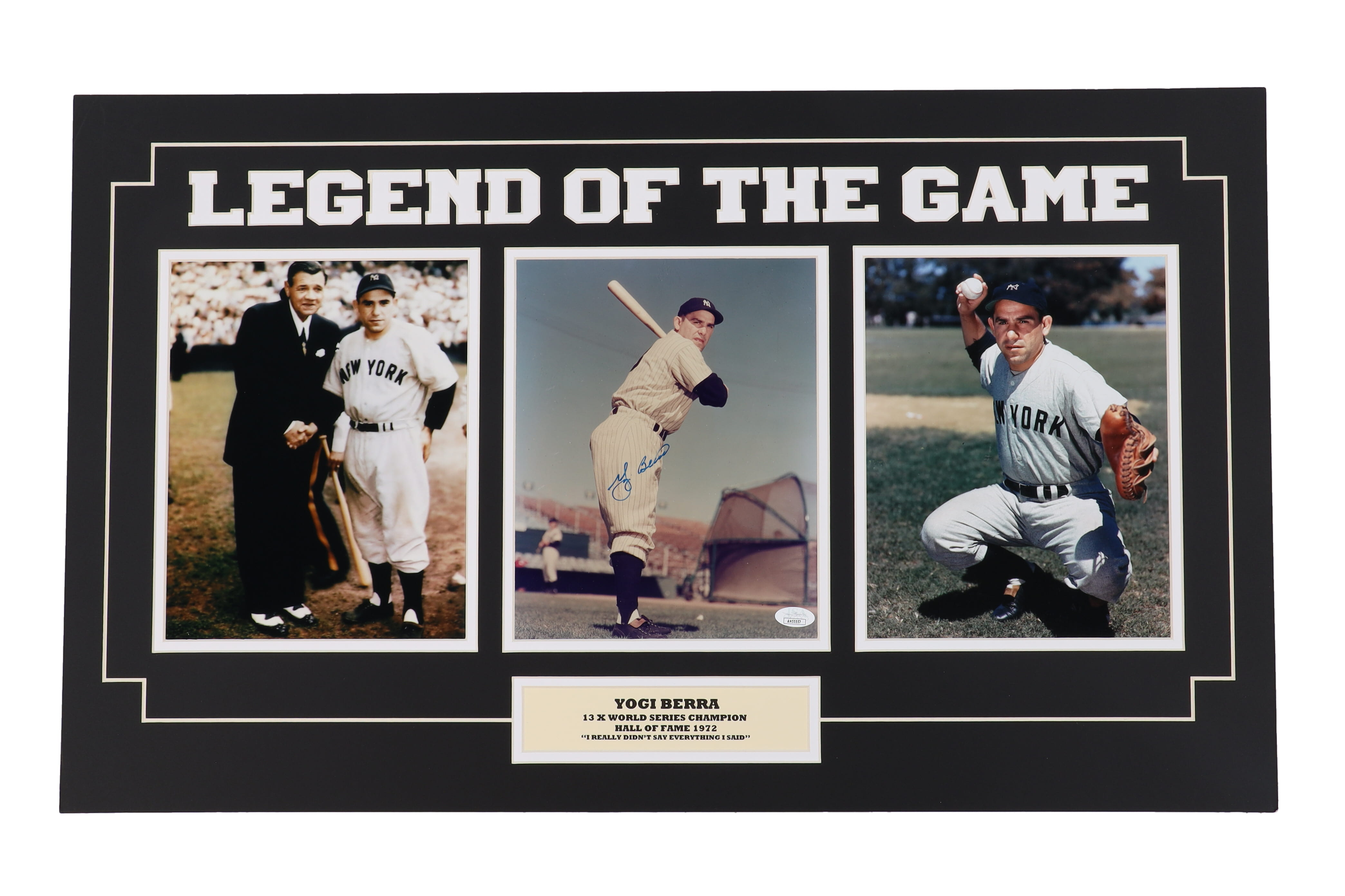 Custom matting measures 18" x 30" in size. Features a photo that has been hand-signed by Yogi Berra (D. 2015, New York Yankees, HOF).