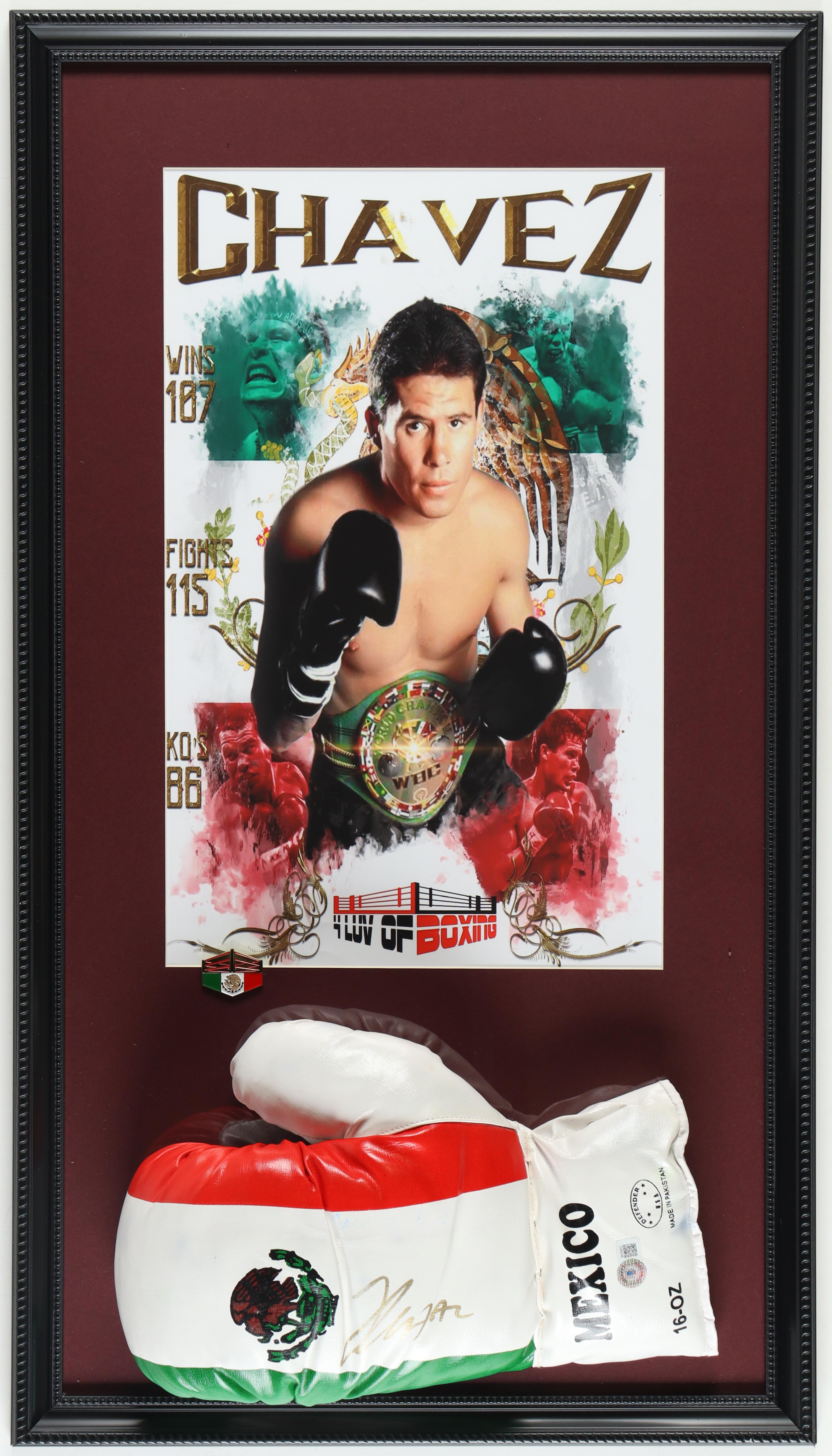 Custom frame measures 17" x 30" in size and features a Mexico Flag boxing glove that has been hand-signed by Julio Cesar Chavez (HOF). The display also includes a photo print and Mexico Boxing pin.