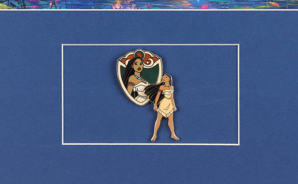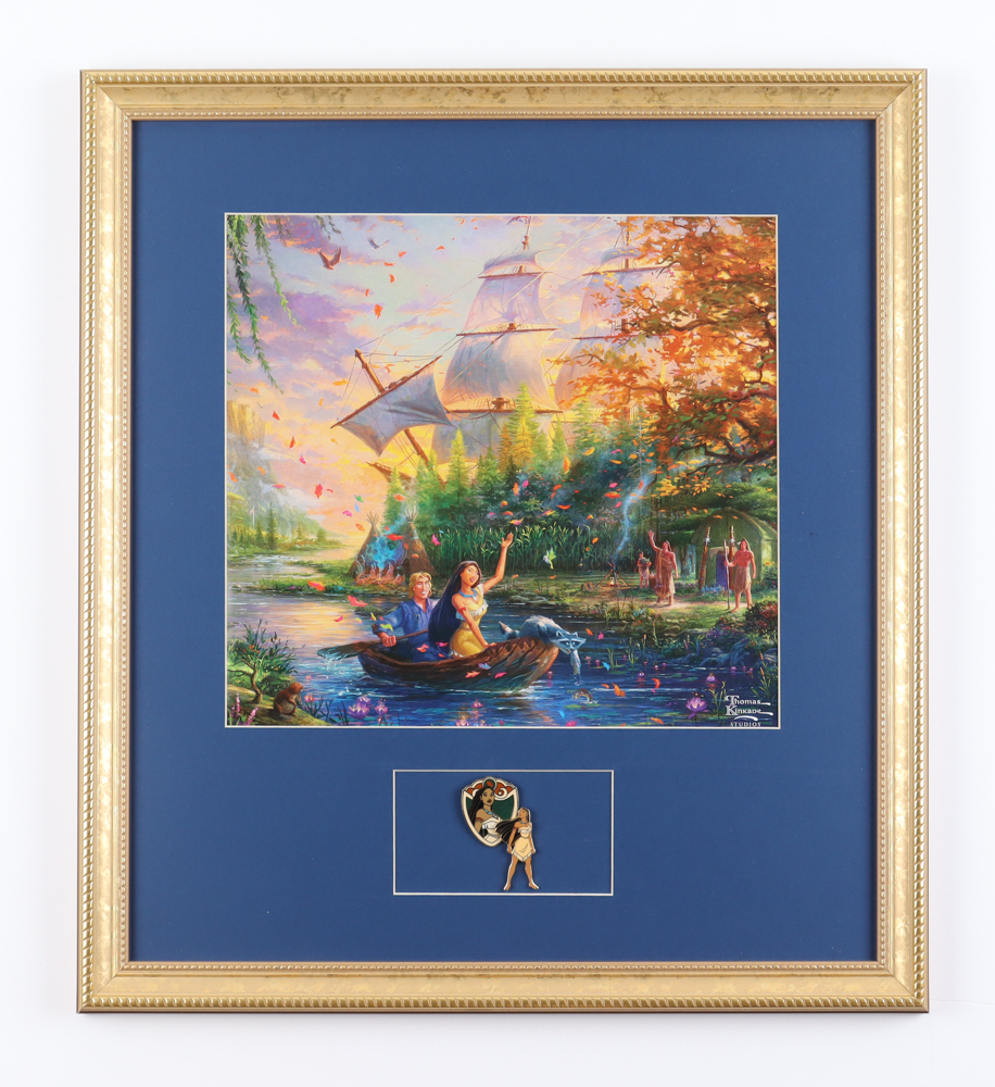 Custom frame measures approximately 18" x 20" in size and features a print of "Pocahontas" by Thomas Kinkade (D. 2012). The display also includes (2) Pocahontas Character Pins. Please note, the display is unsigned.