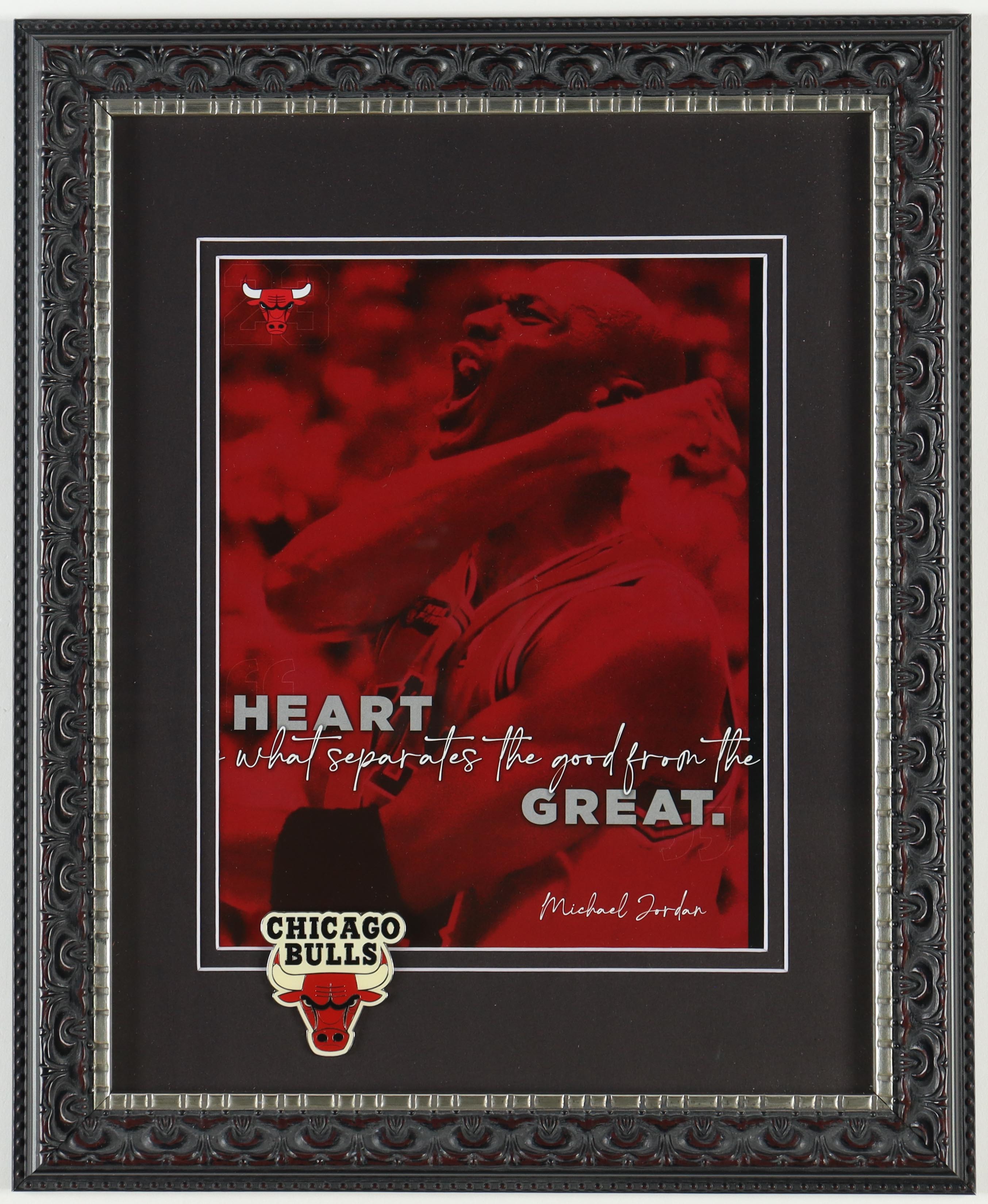 Custom frame measures approximately 13.5" x 16" in size and features a photo of Michael Jordan (Chicago Bulls, HOF). The display also includes a large metal Bulls logo emblem. Please note, the display is unsigned.