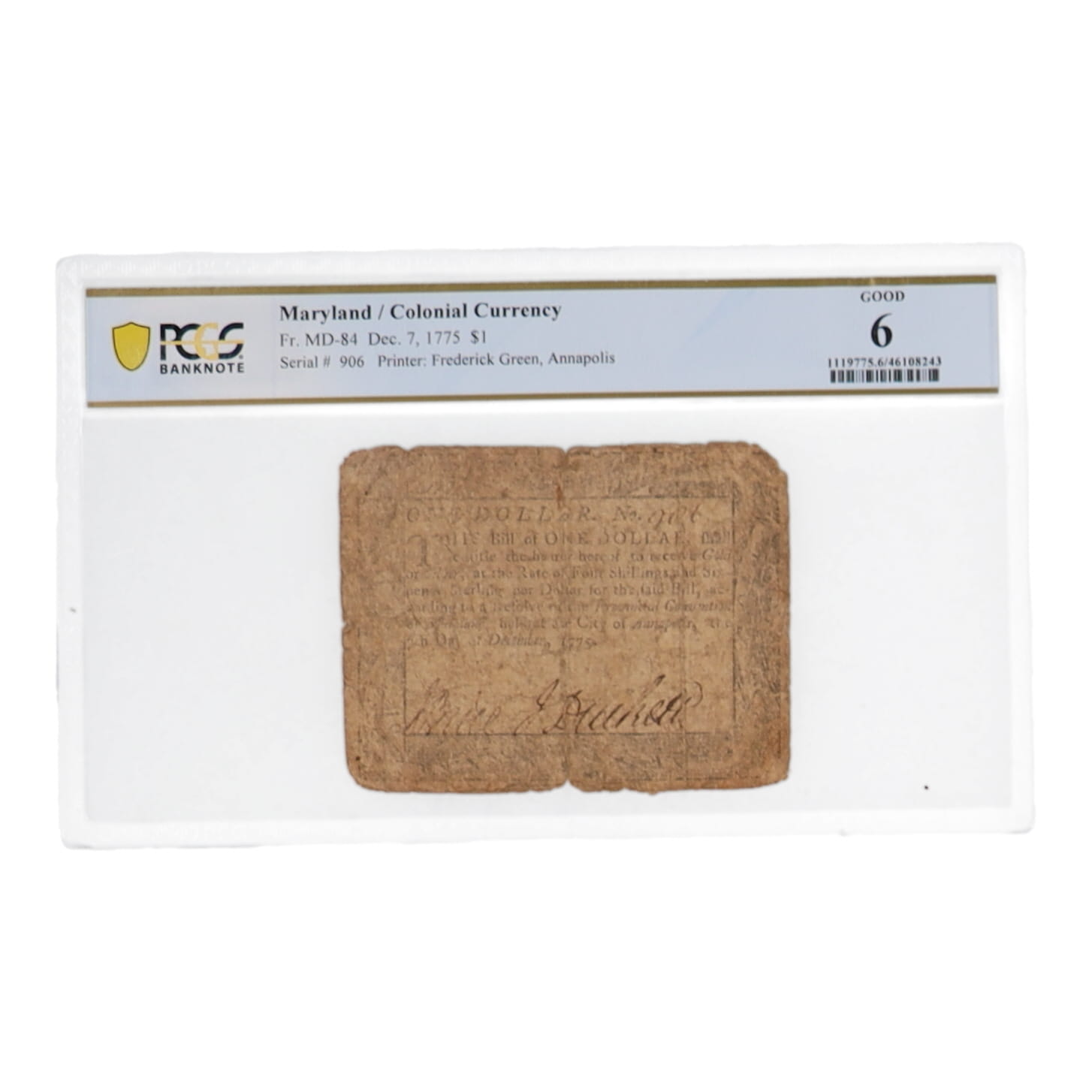 1775 $1 American Revolution, Colonial Currency - Maryland (PCGS GOOD 6) -