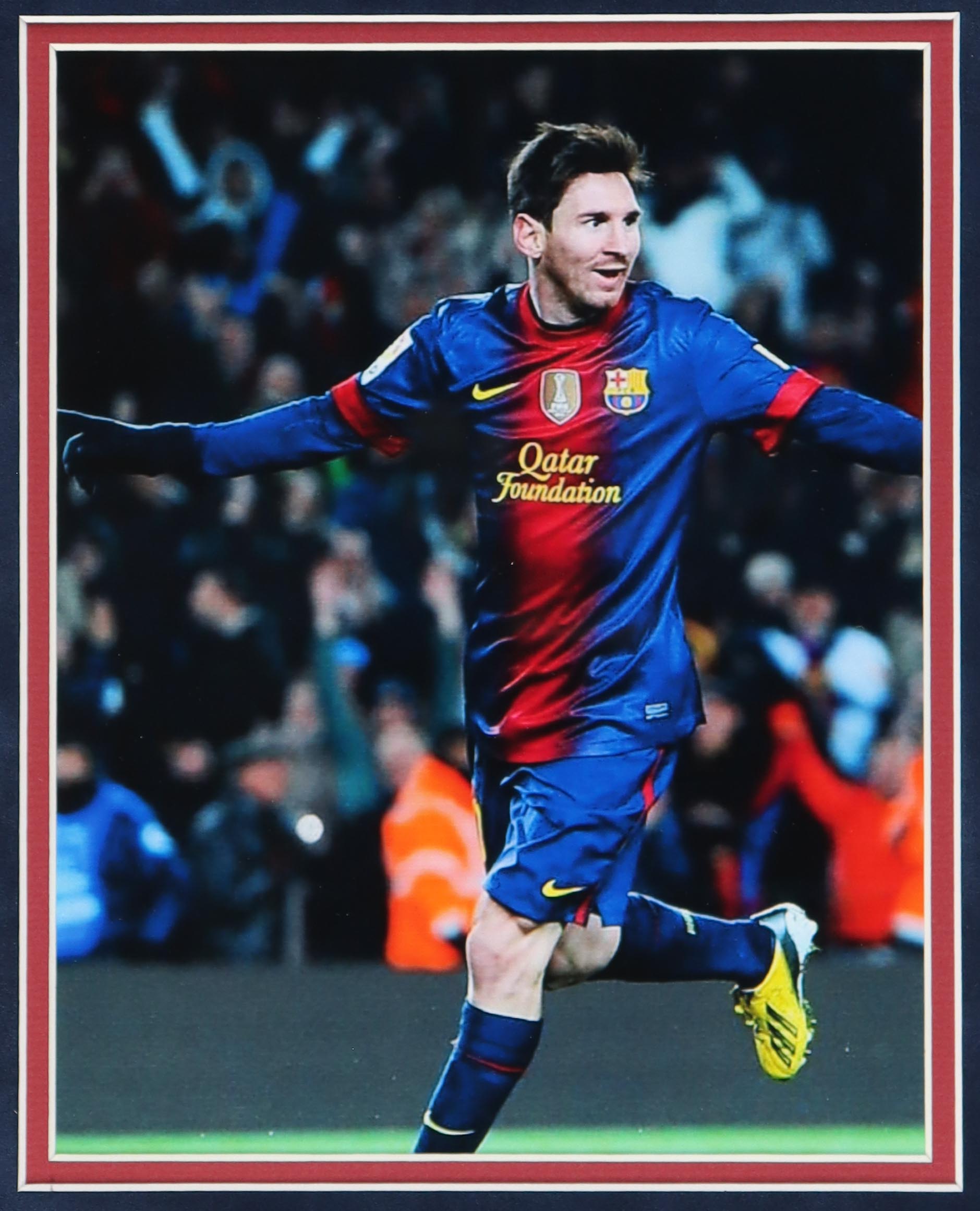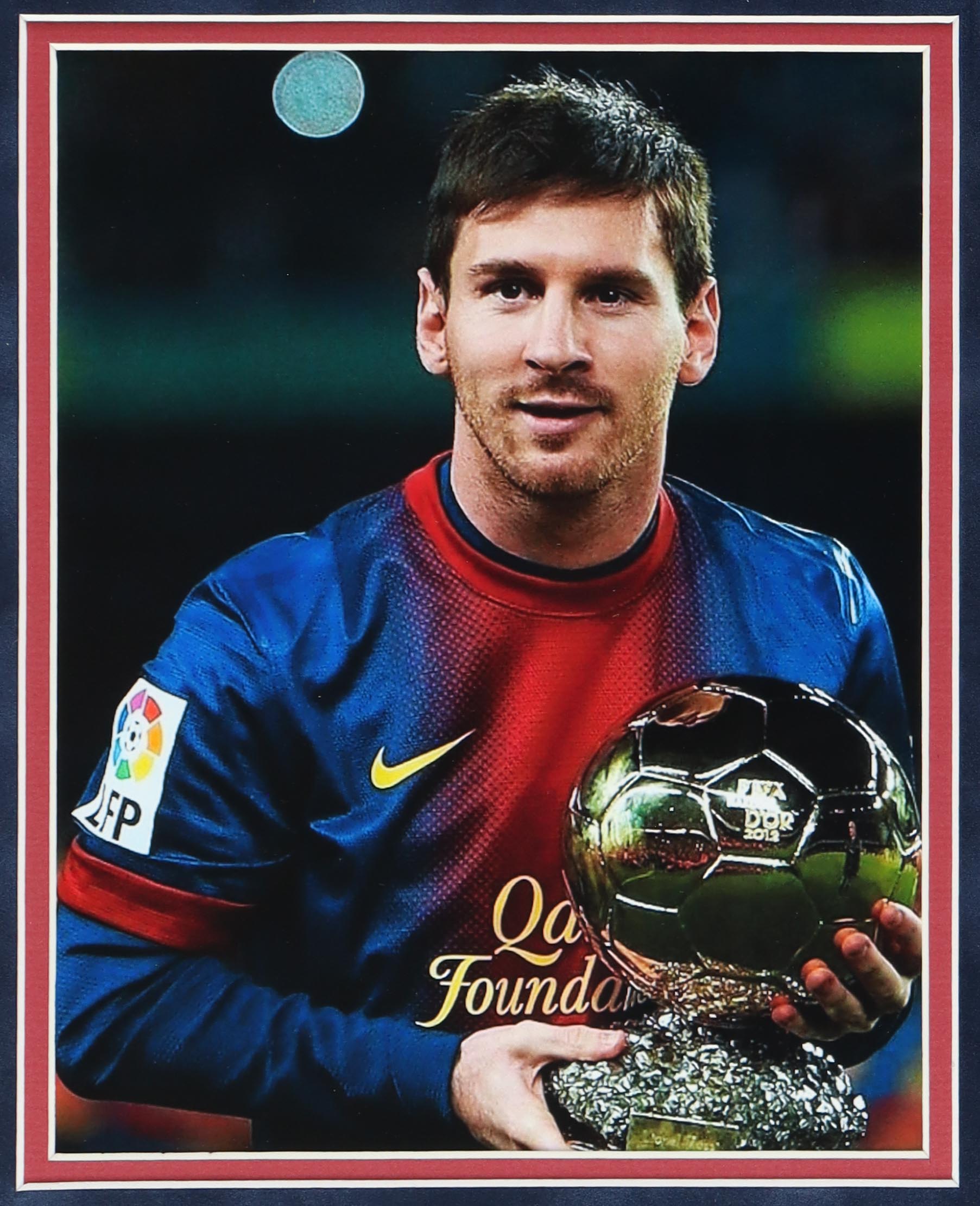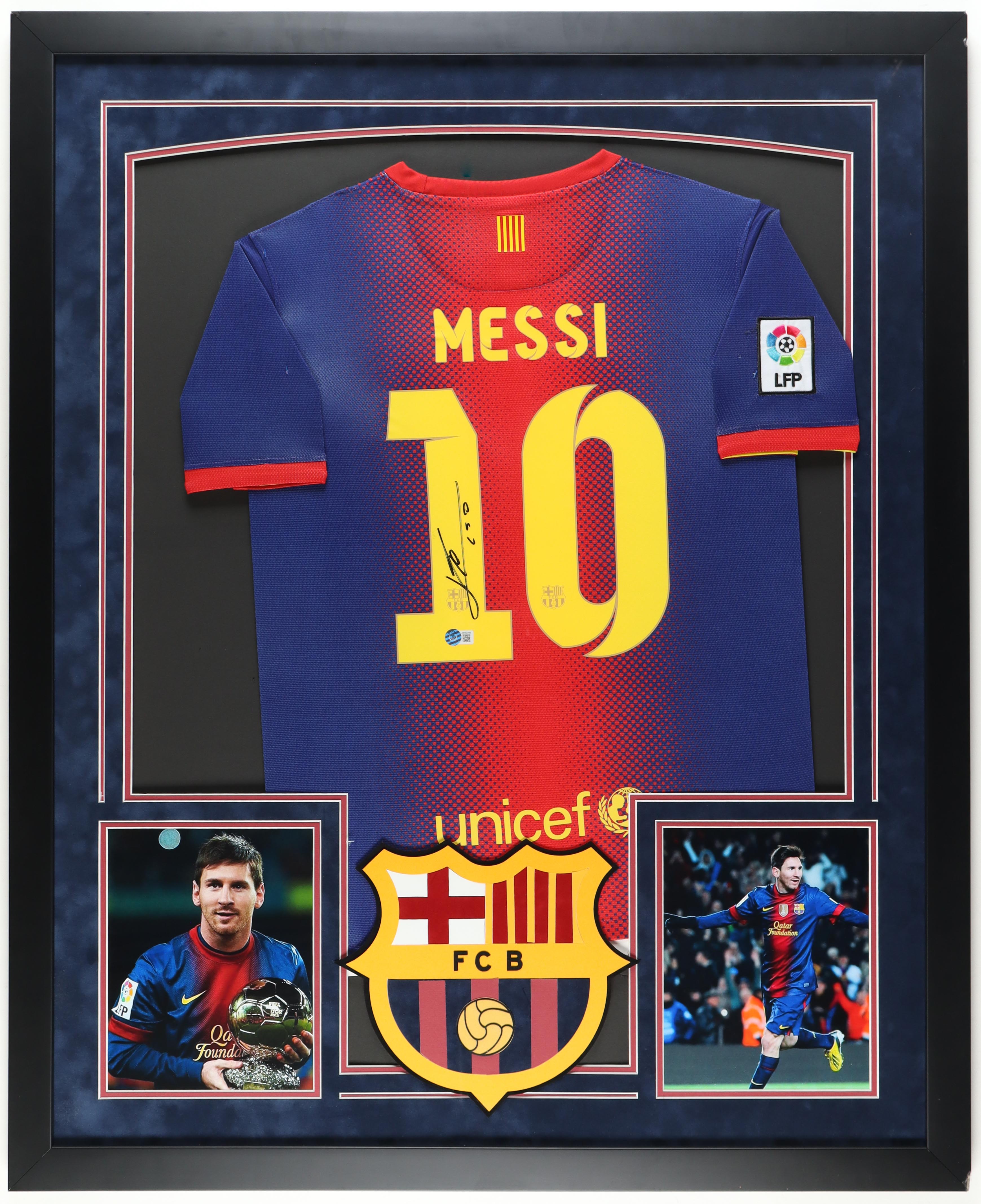 Custom frame measures 36" x 43" in size and features a jersey that has been hand-signed by Lionel Messi. Please note, the top right corner of the frame shows signs of wear.
