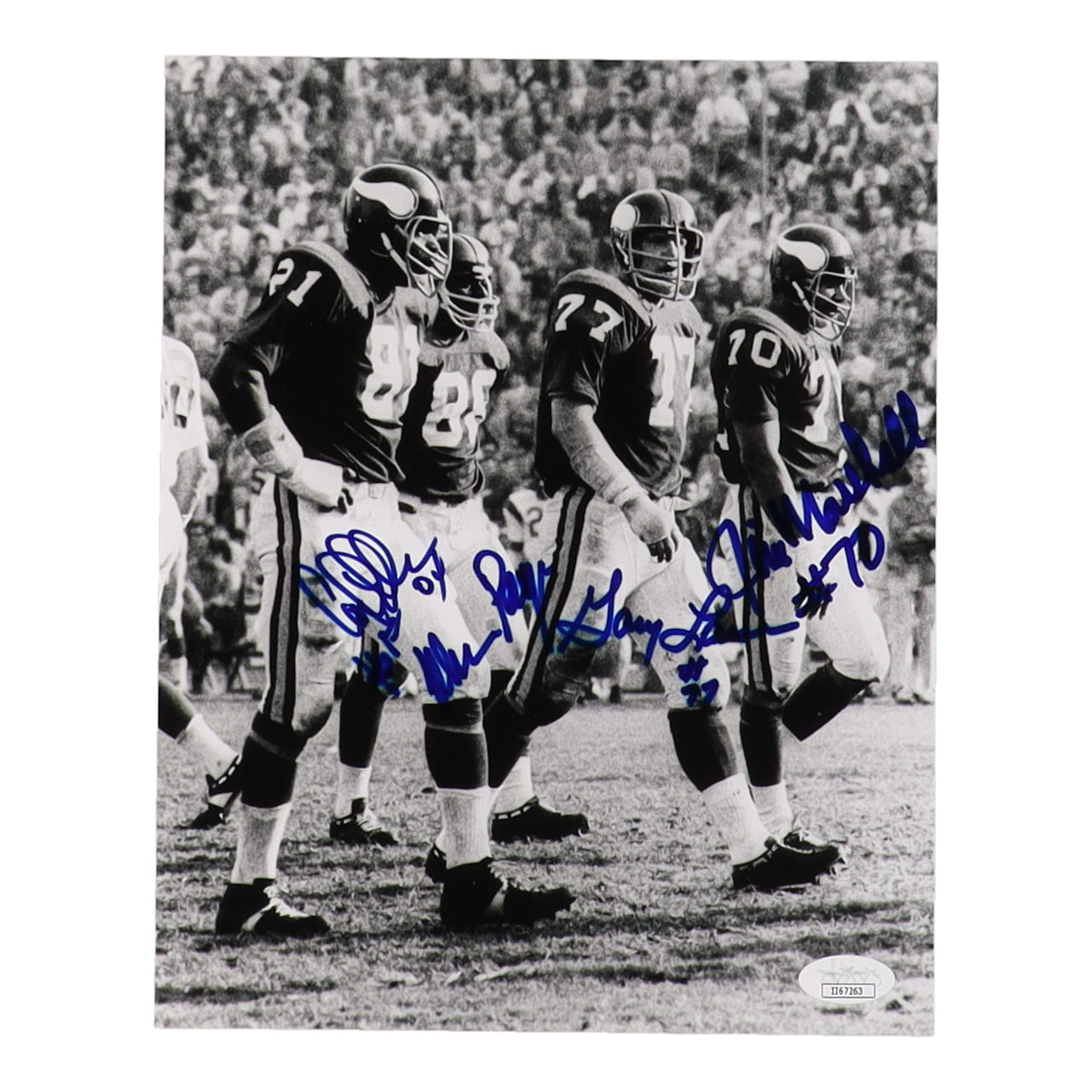 Photo measures 8" x 10" in size and has been hand-signed by Carl Eller (HOF), Alan Page (HOF), Gary Larsen and Jim Marshall.