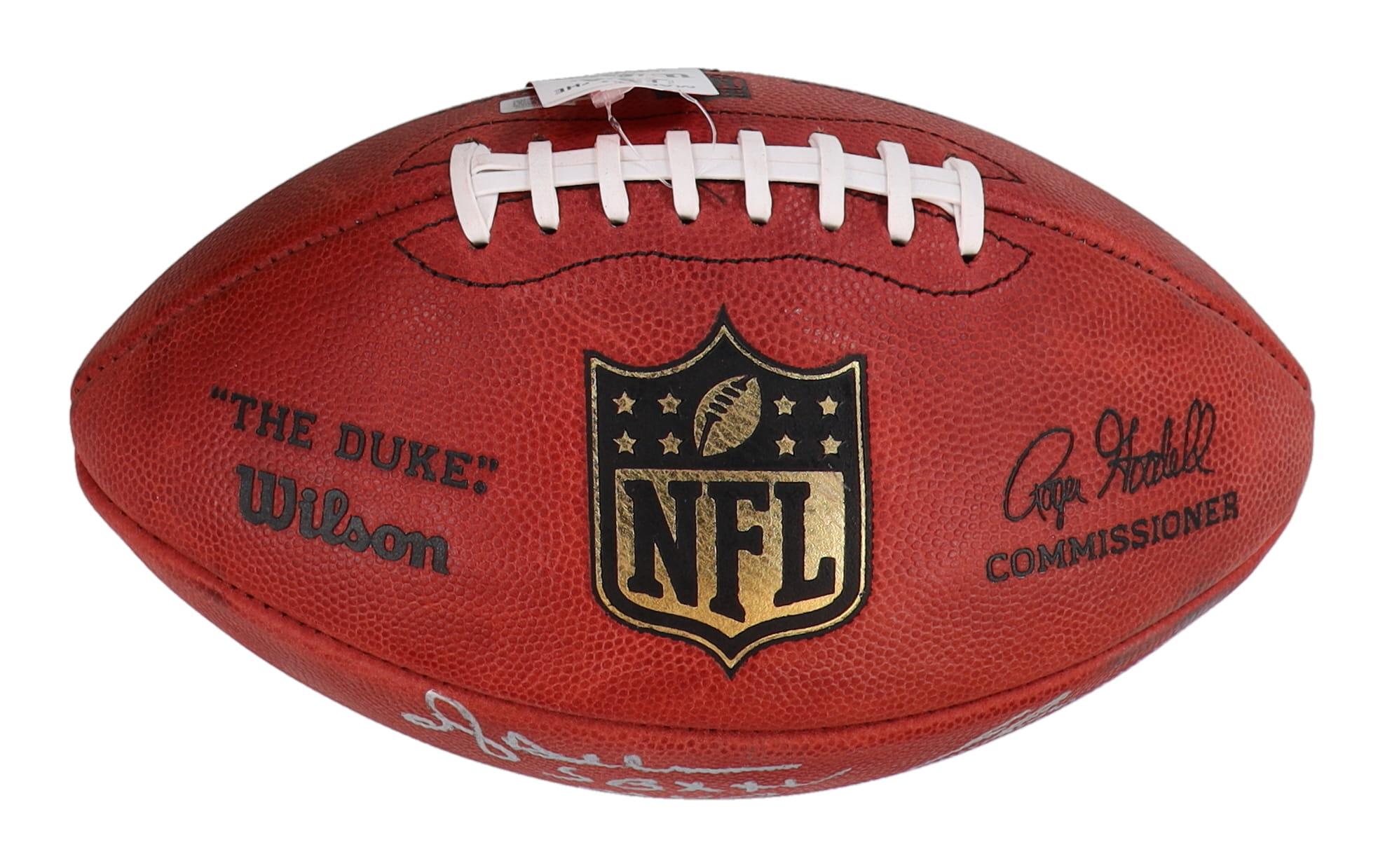 Wilson Official NFL "The Duke" Football. Hand-signed and inscribed by Eli Manning, Phil Simms and Otis Anderson (New York Giants). Please note, Eli Manning signature and inscriptions are smudged. Refer to photos for condition of the item.