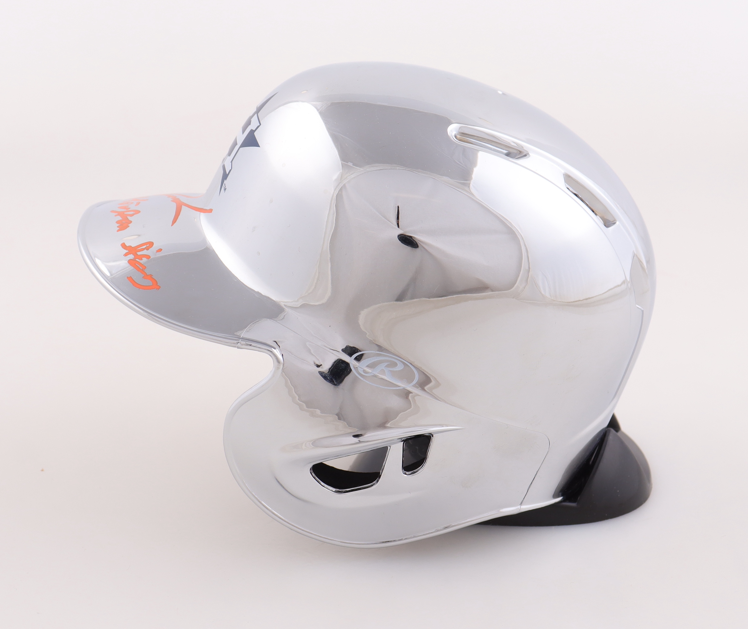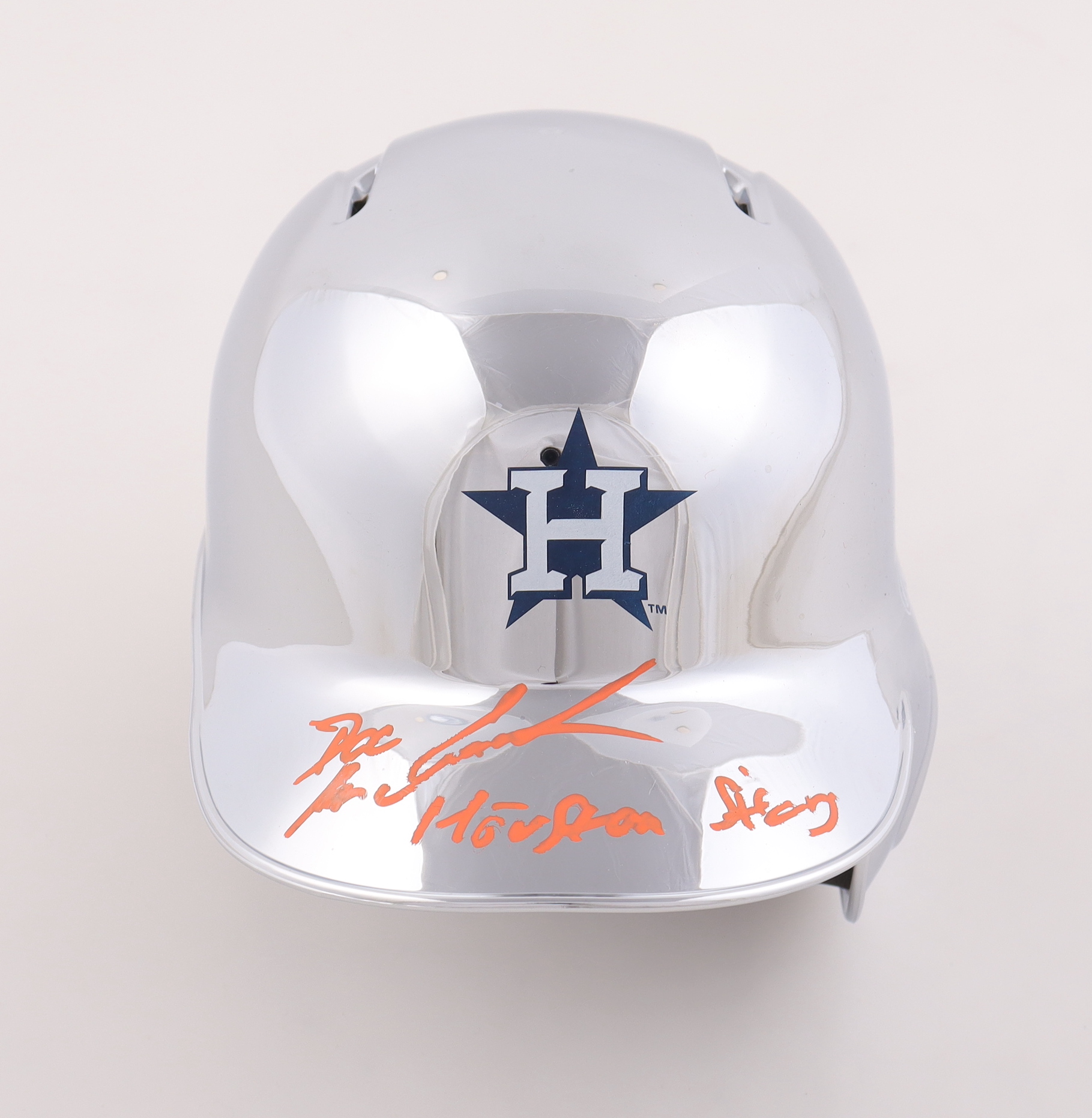 Riddell Houston Astros chrome batting mini helmet. Hand-signed and inscribed by Dwight "Doc" Gooden. Please note, there is slight scuffing on the insciption.