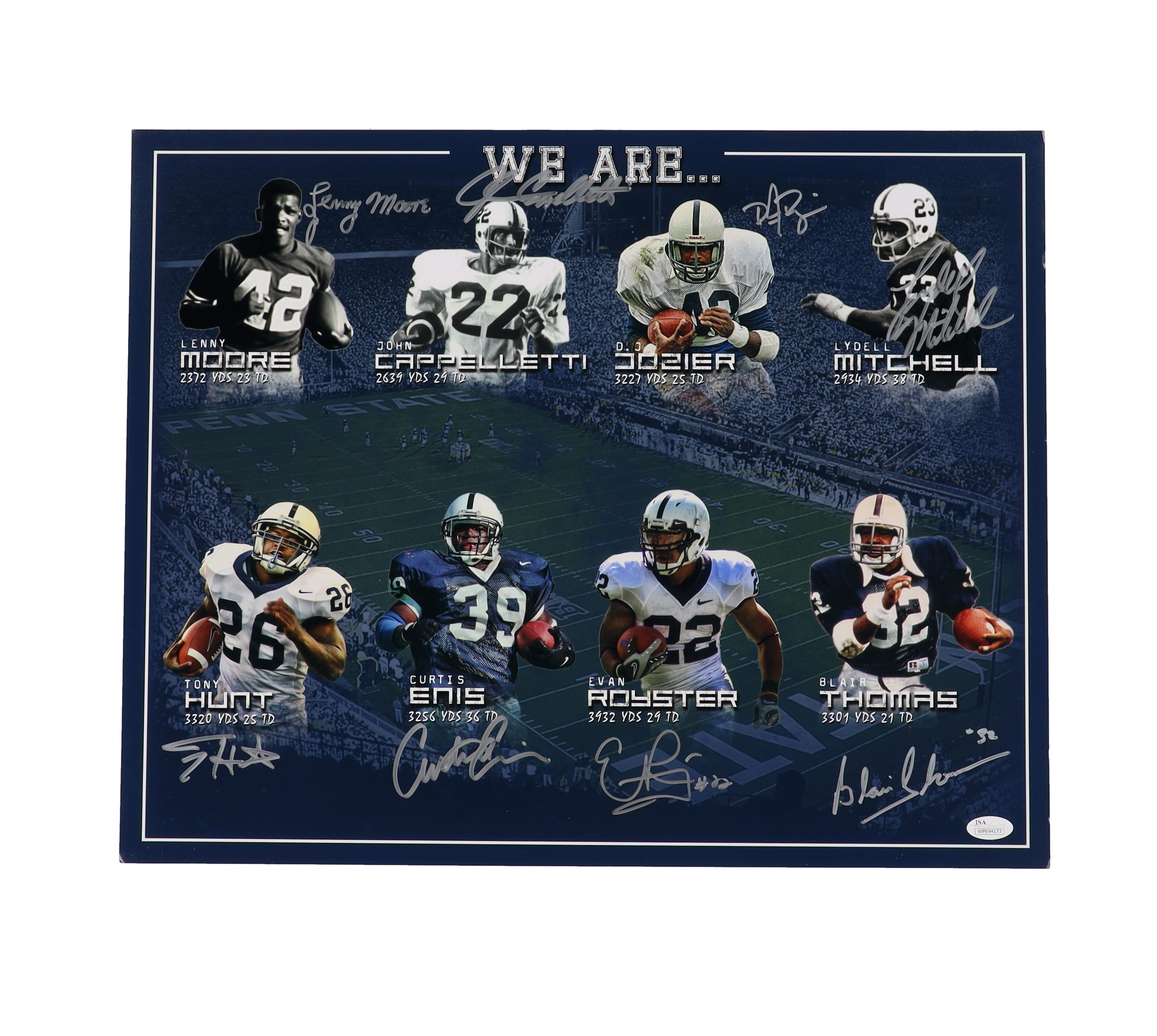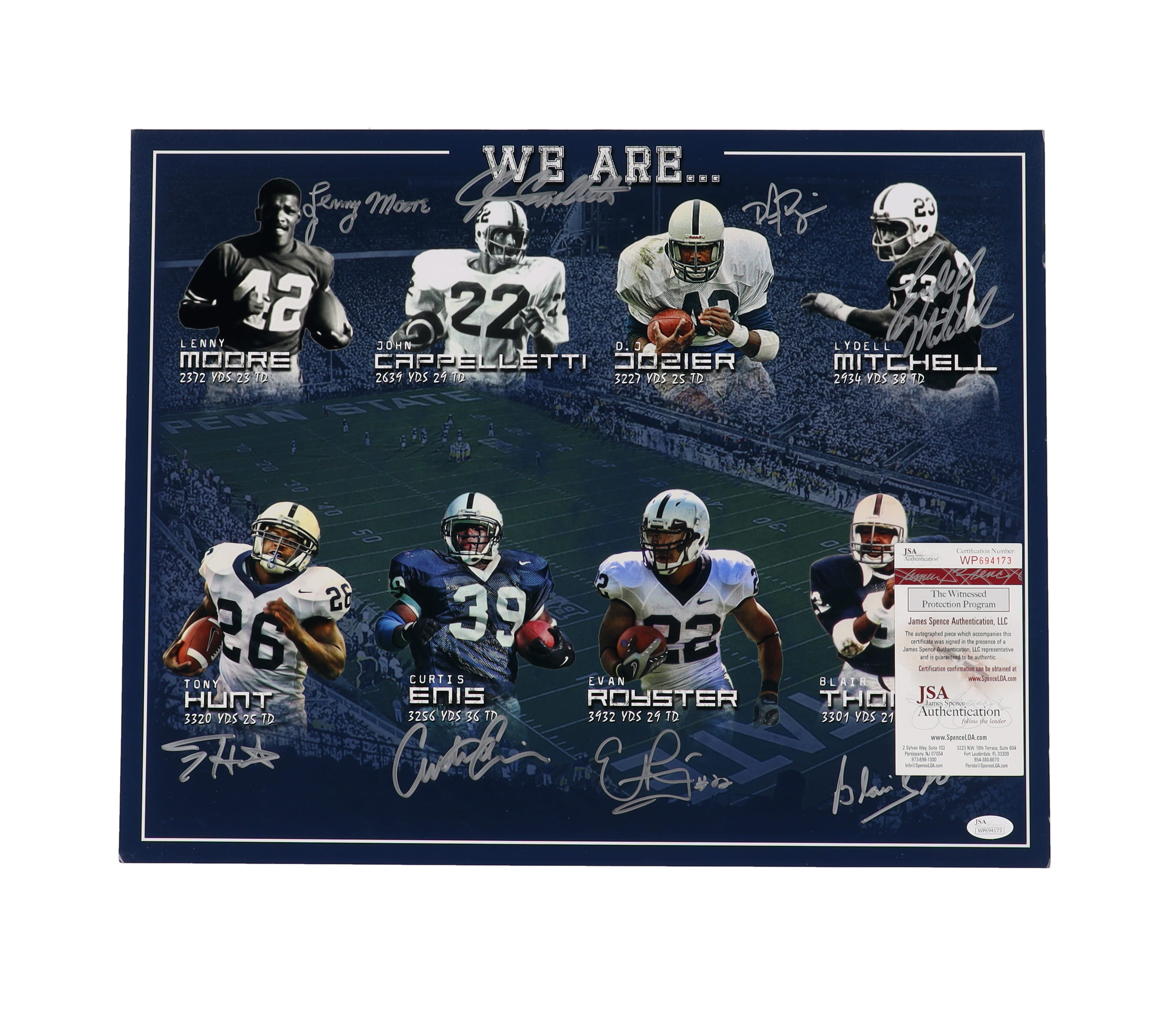 Photo measures 16" x 20" in size. Hand-signed by (8) including Lenny Moore, John Cappelletti, DJ Dozier, Lydell Mitchell, Tony Hunt, Curtis Enis, Evan Royster and Blair Thomas.