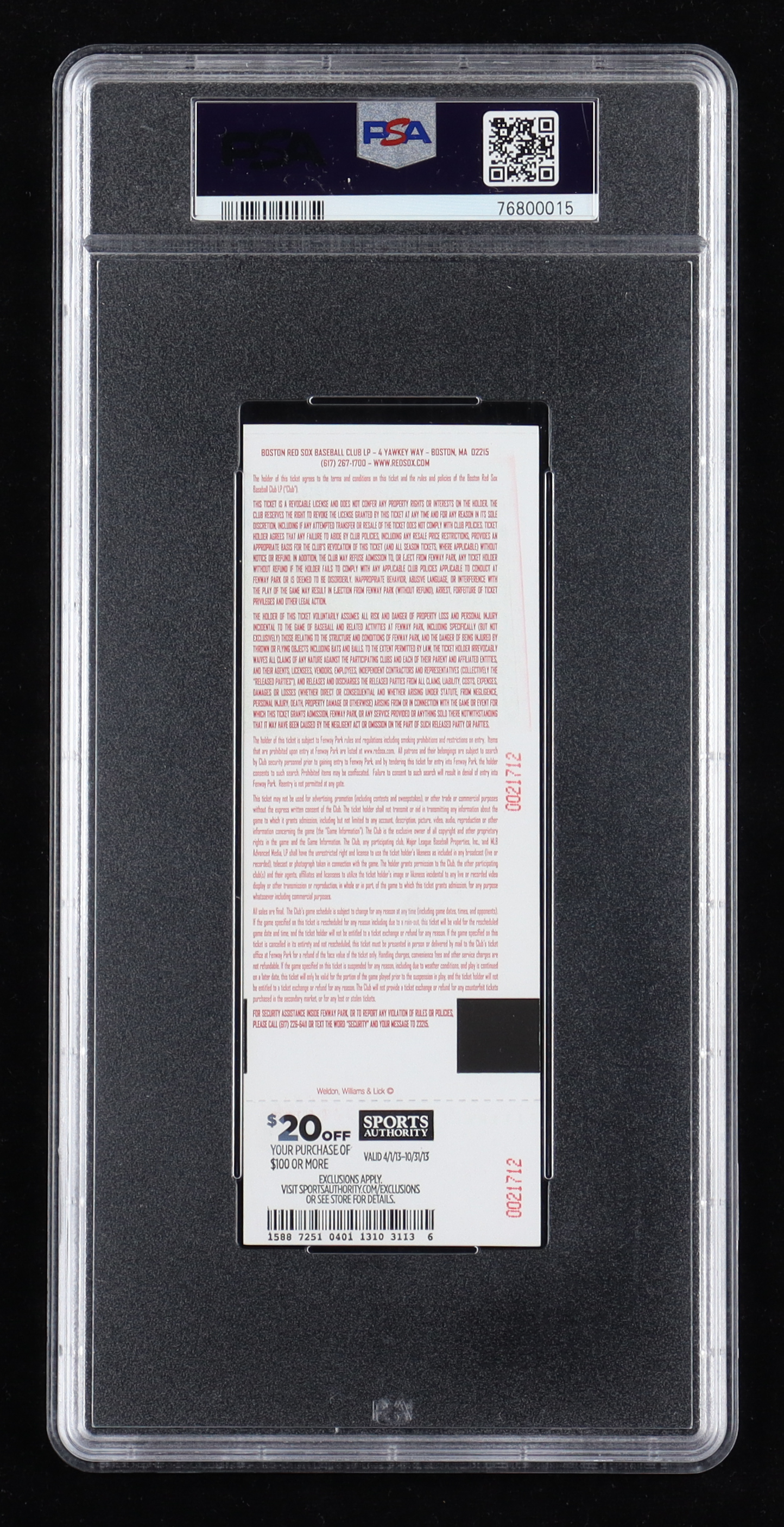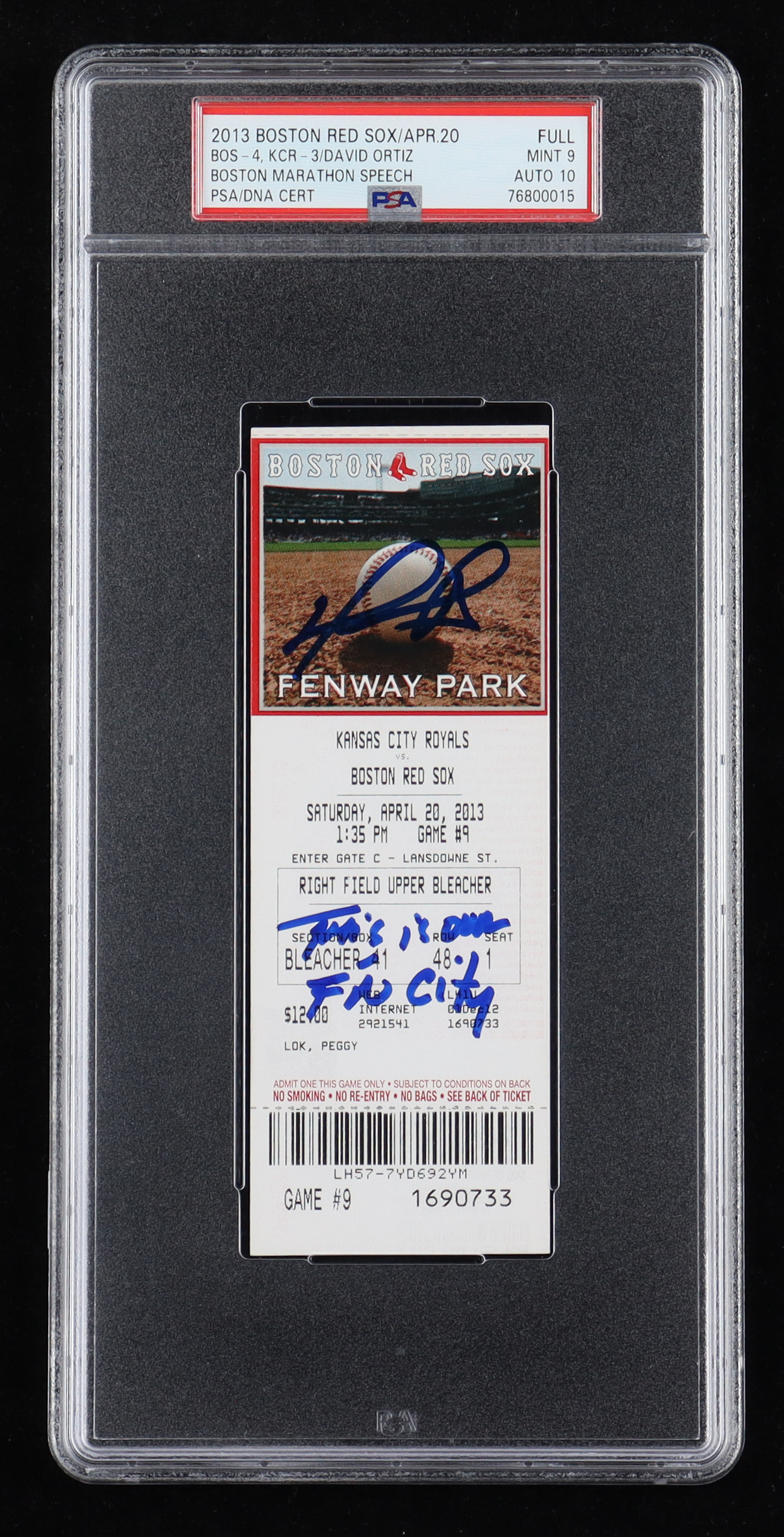 April 20th, 2013 Kansas City Royals vs Boston Red Sox game ticket has been hand-signed and inscribed by David Ortiz. The ticket has been graded a mint 9 by PSA with the autograph receiving a gem mint 10 grade.