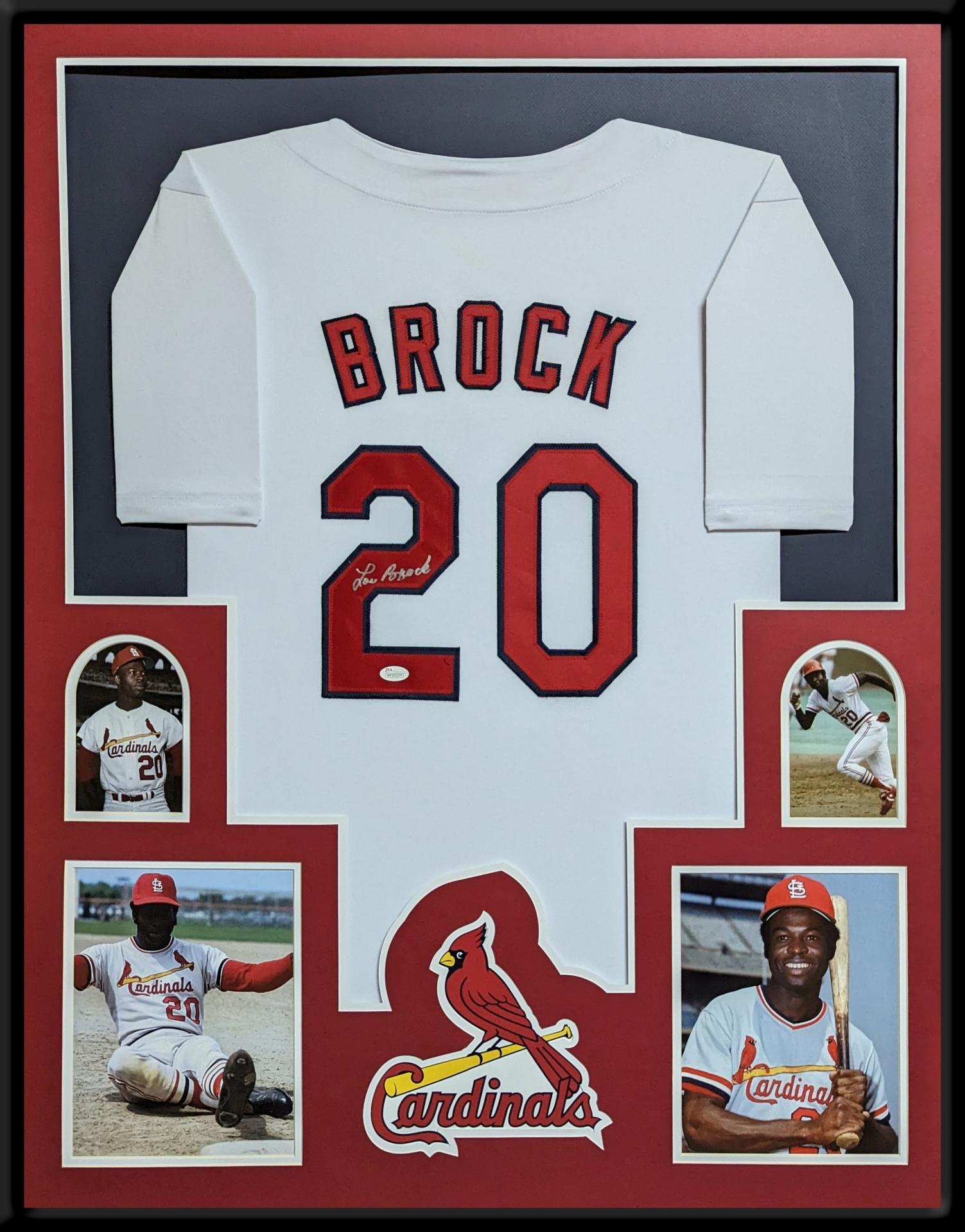 Custom framed display measures 34" x 42" in size and features a jersey that has been hand-signed by Lou Brock (D. 2020, HOF).