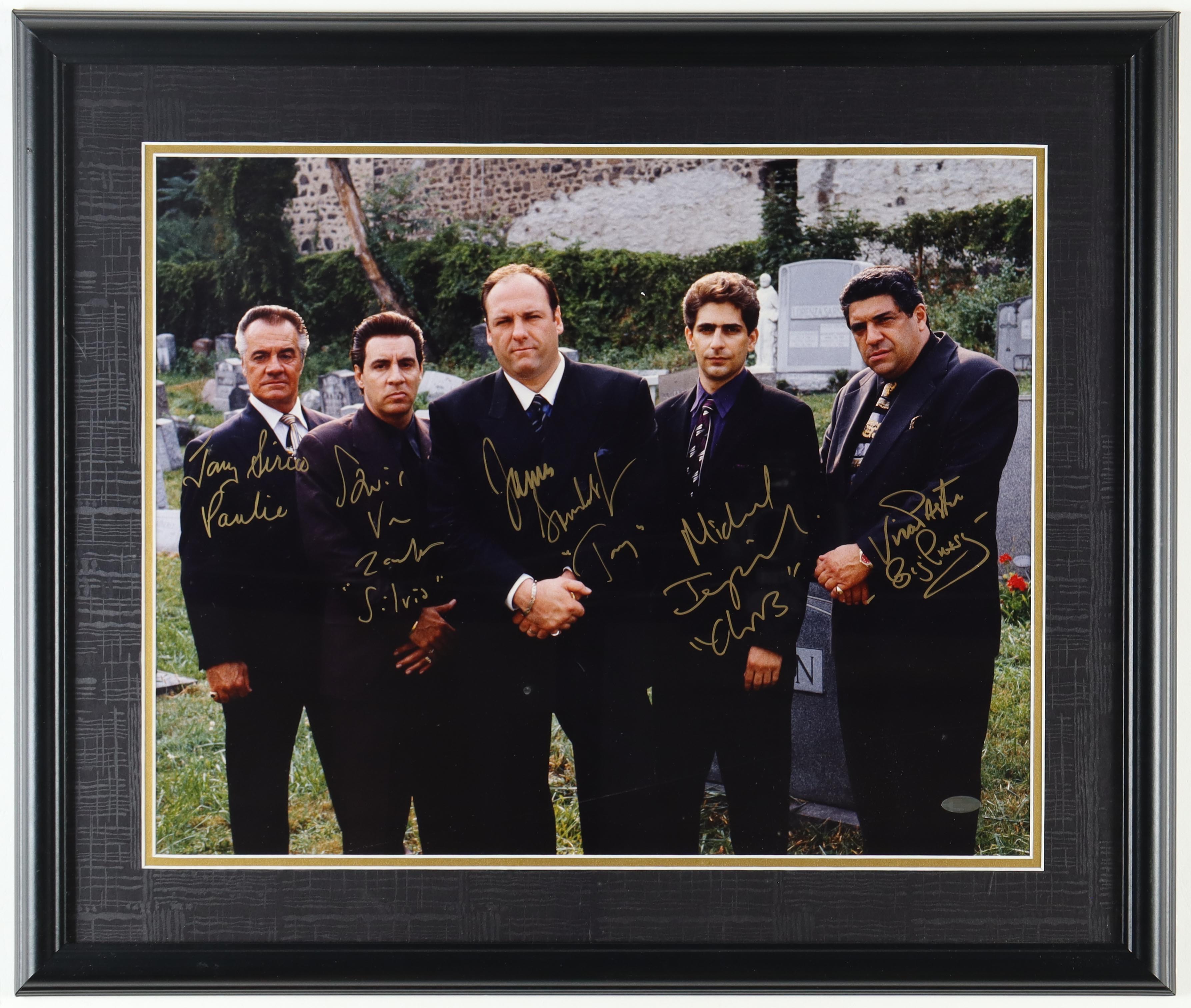 Custom framed display measures 22" x 26" in size and has been hand signed and inscribed by James Joseph Gandolfini Jr. (D. 2013), Michael Imperioli, Steven Van Zandt, Tony Sirico & Vincent Pastore.