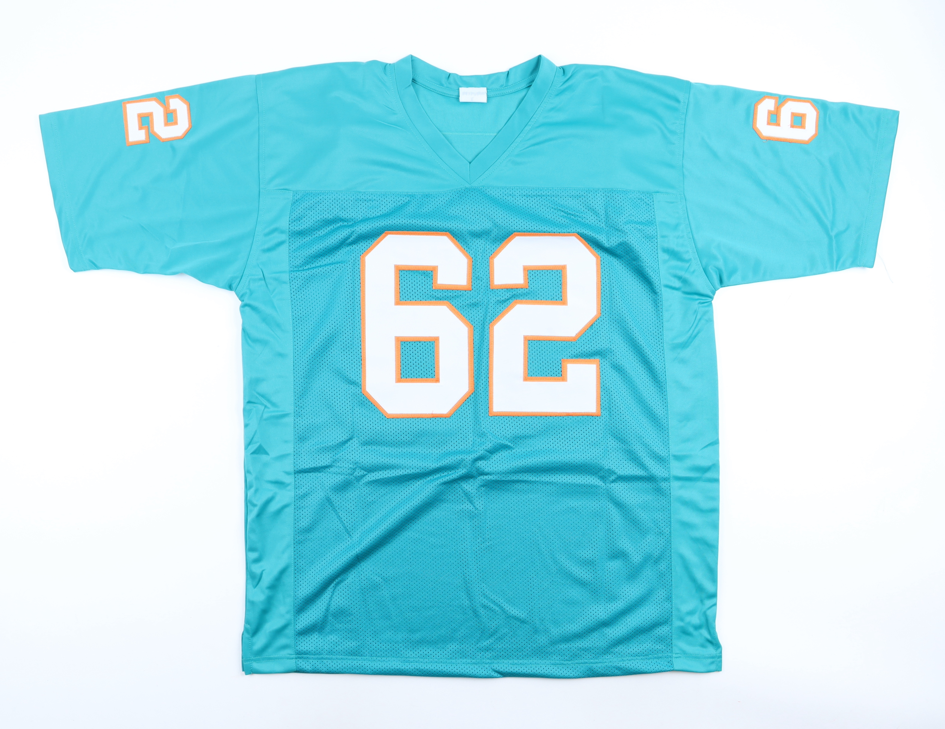 Custom jersey. Everything sewn on, size XL. Hand-signed and inscribed by Jim Langer (HOF). Please note, the signature and inscription have bled.