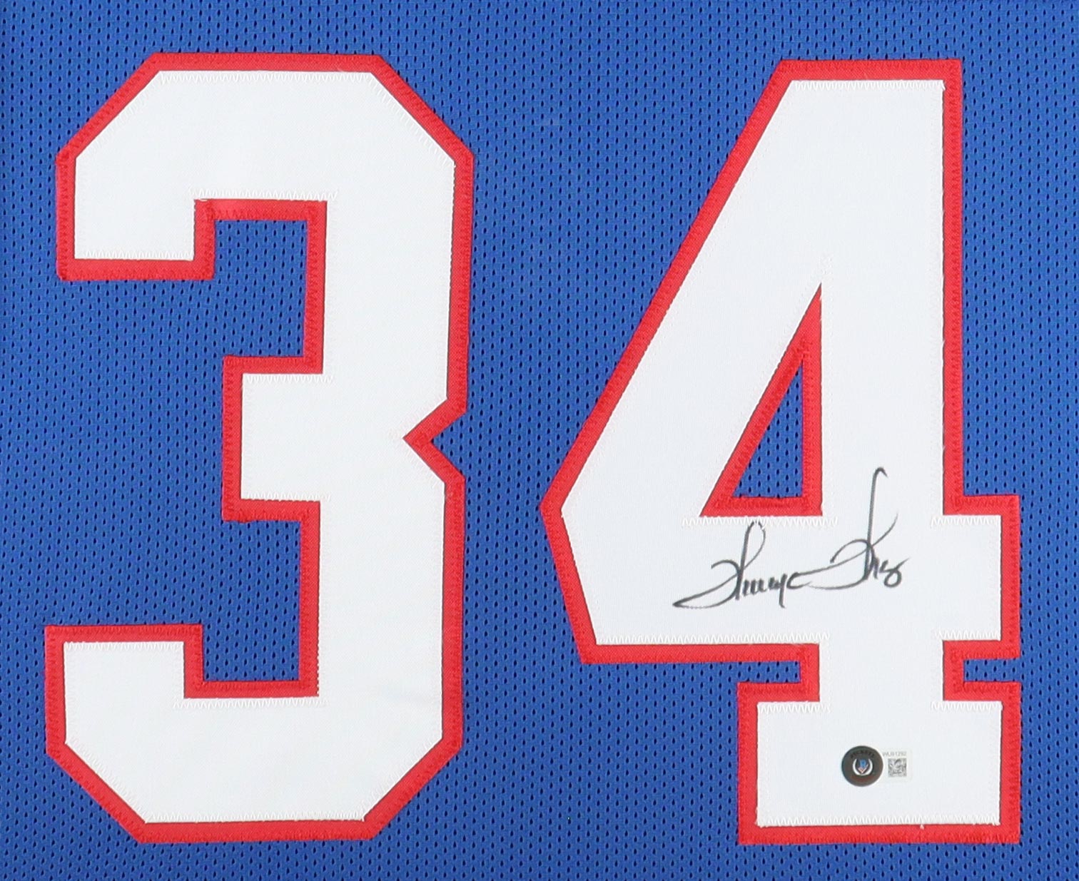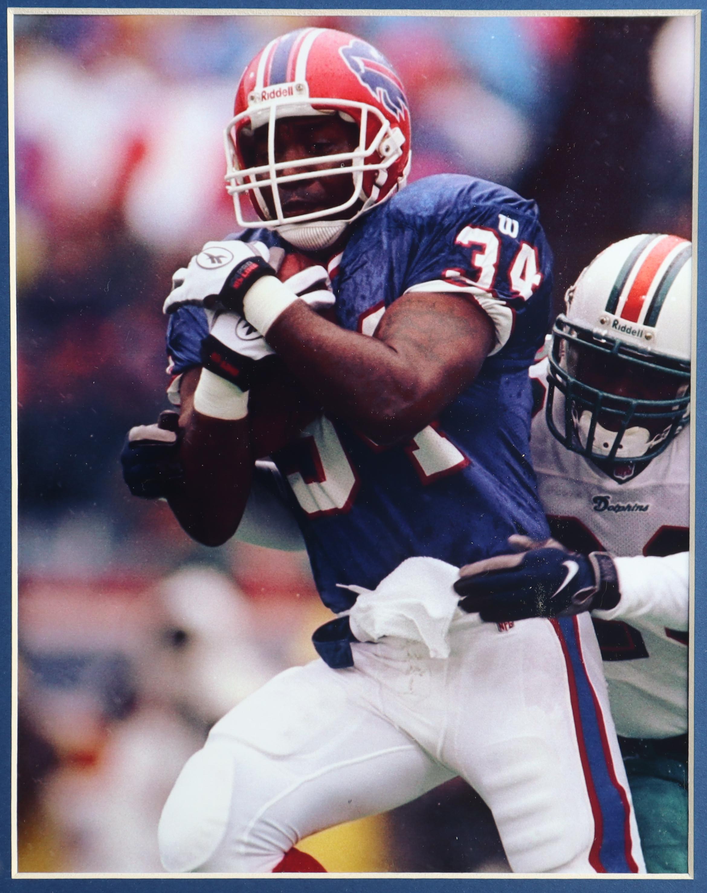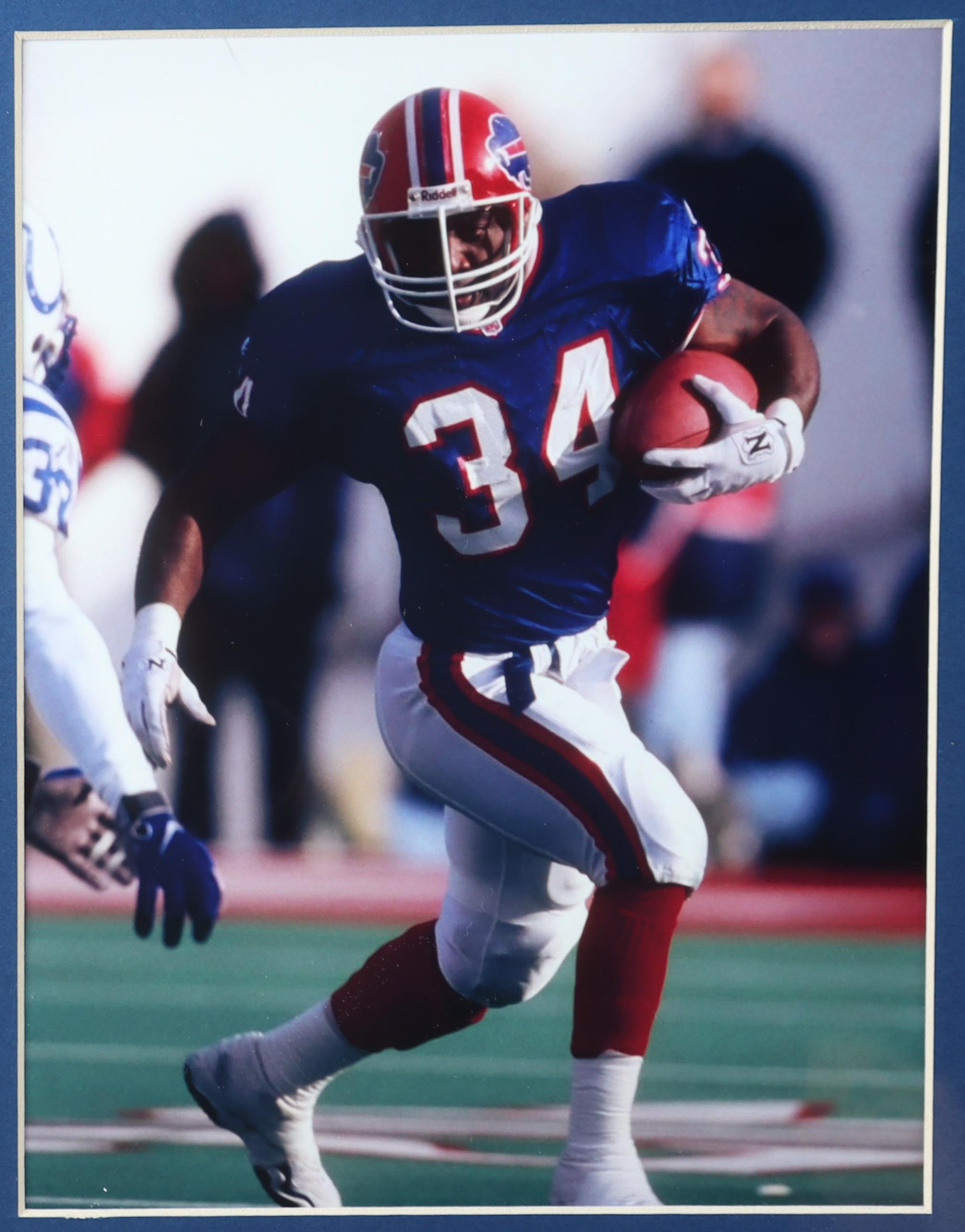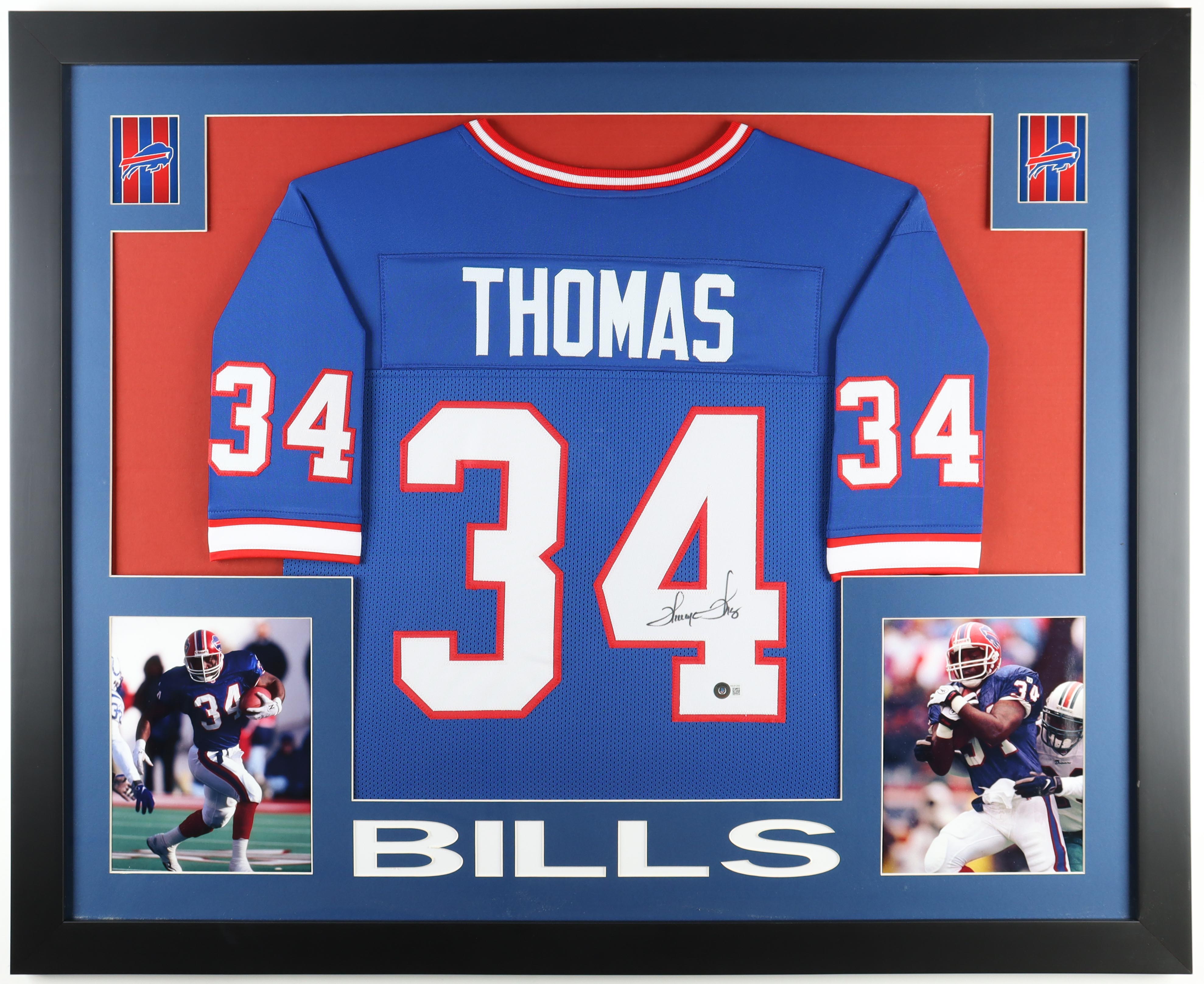 Custom frame measures 35.5" x 44" in size. Features a jersey that has been hand-signed by Thurman Thomas (HOF).