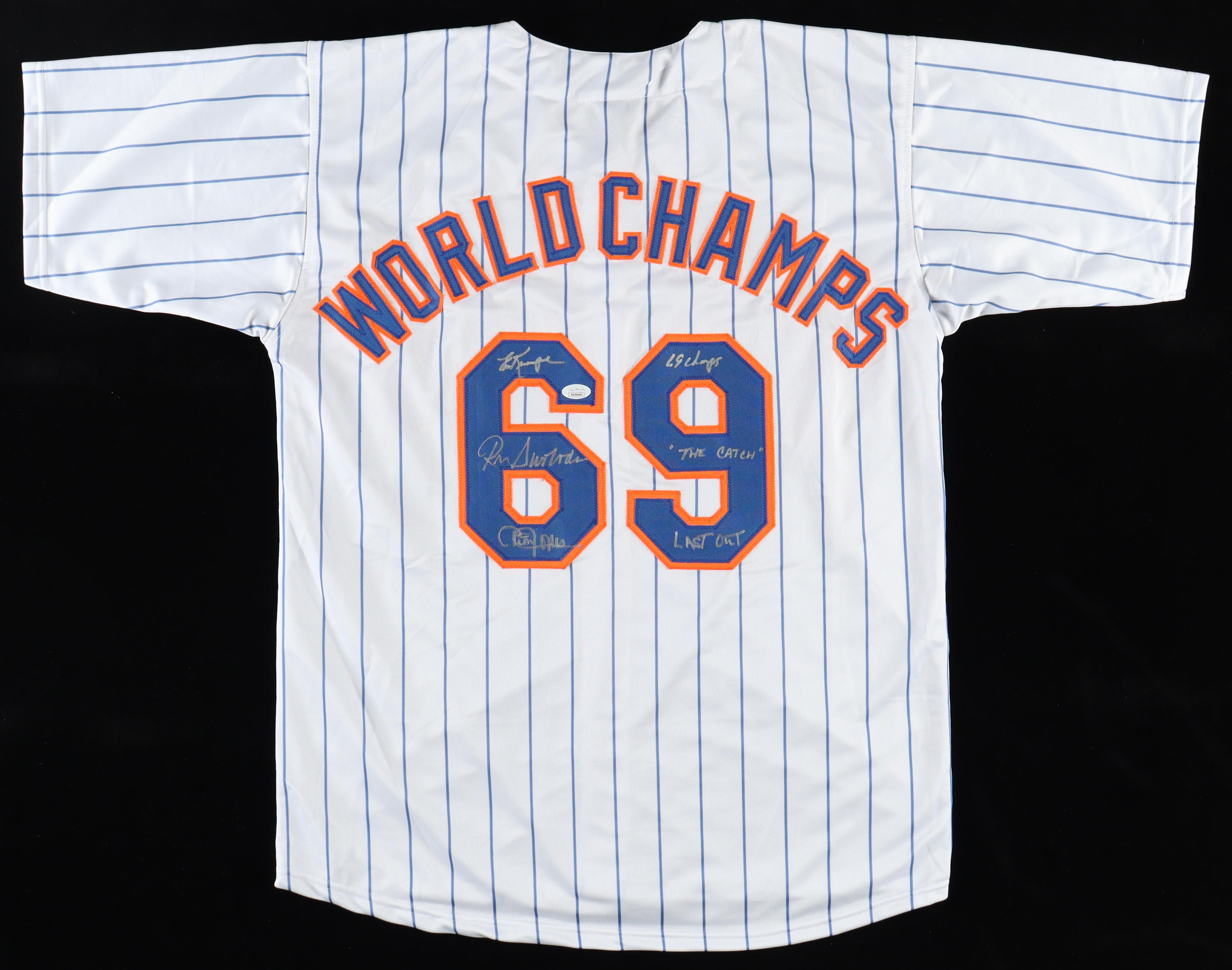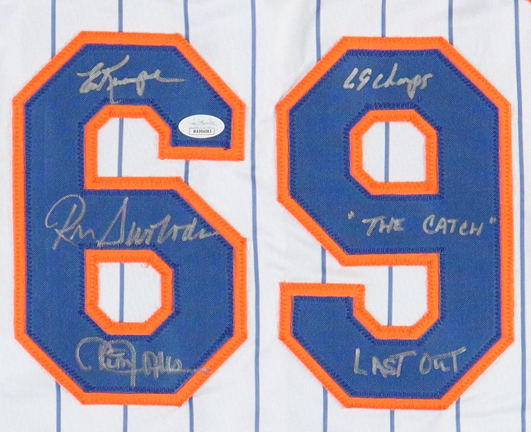 Cleon Jones, Ed Kranepool & Ron Swoboda Signed Jersey Inscribed "69 Champs", "The Catch" & "Last Out" (JSA)