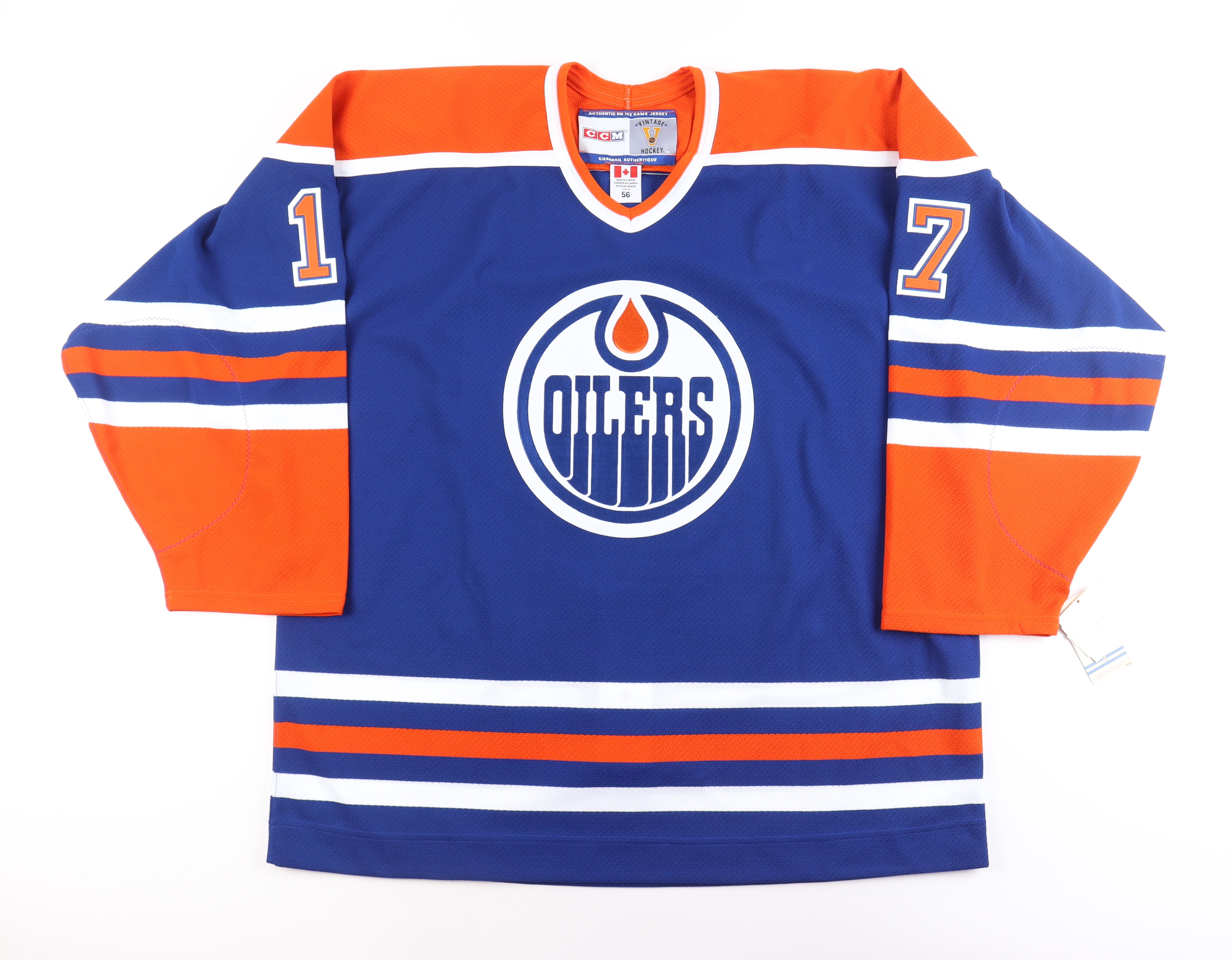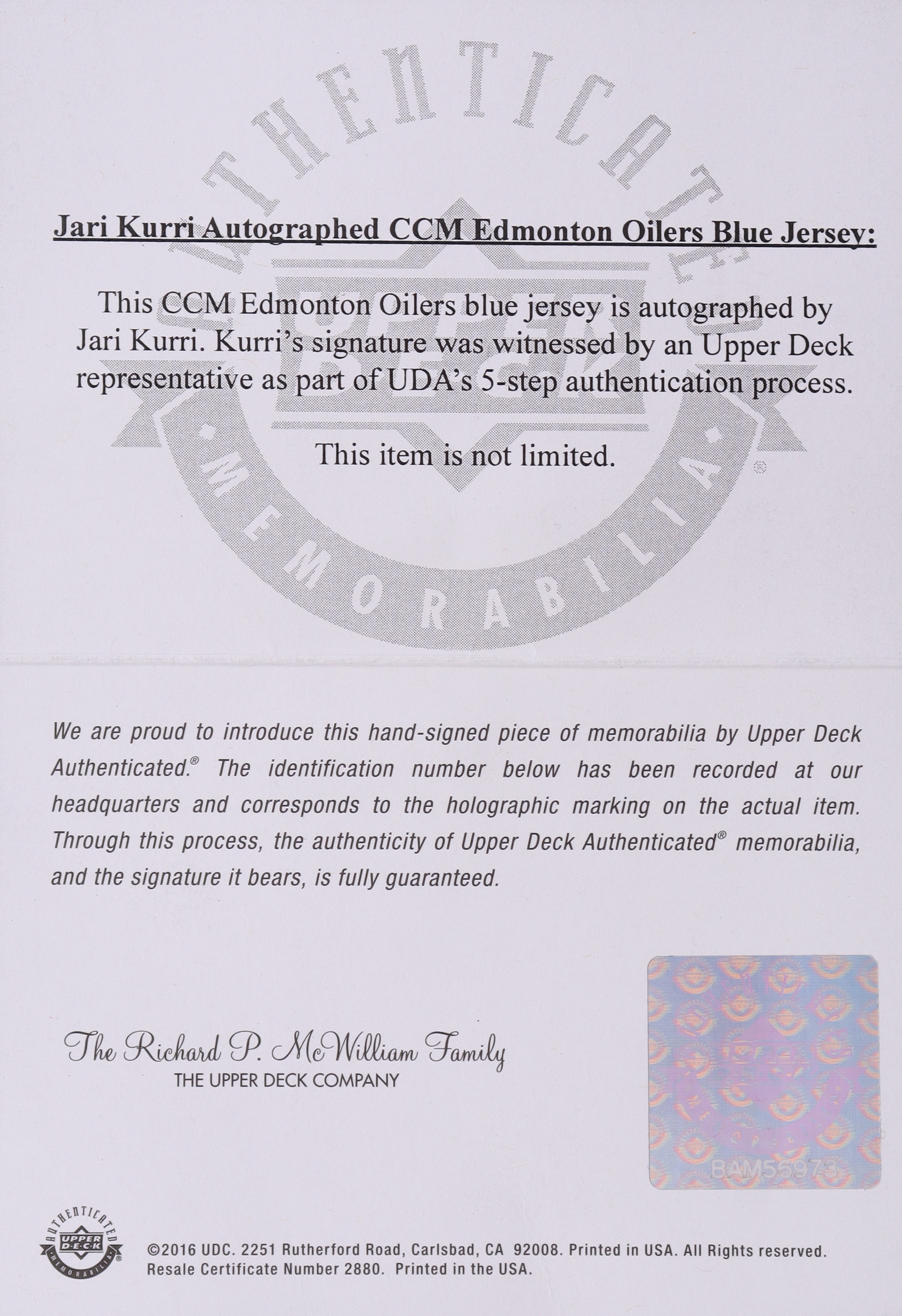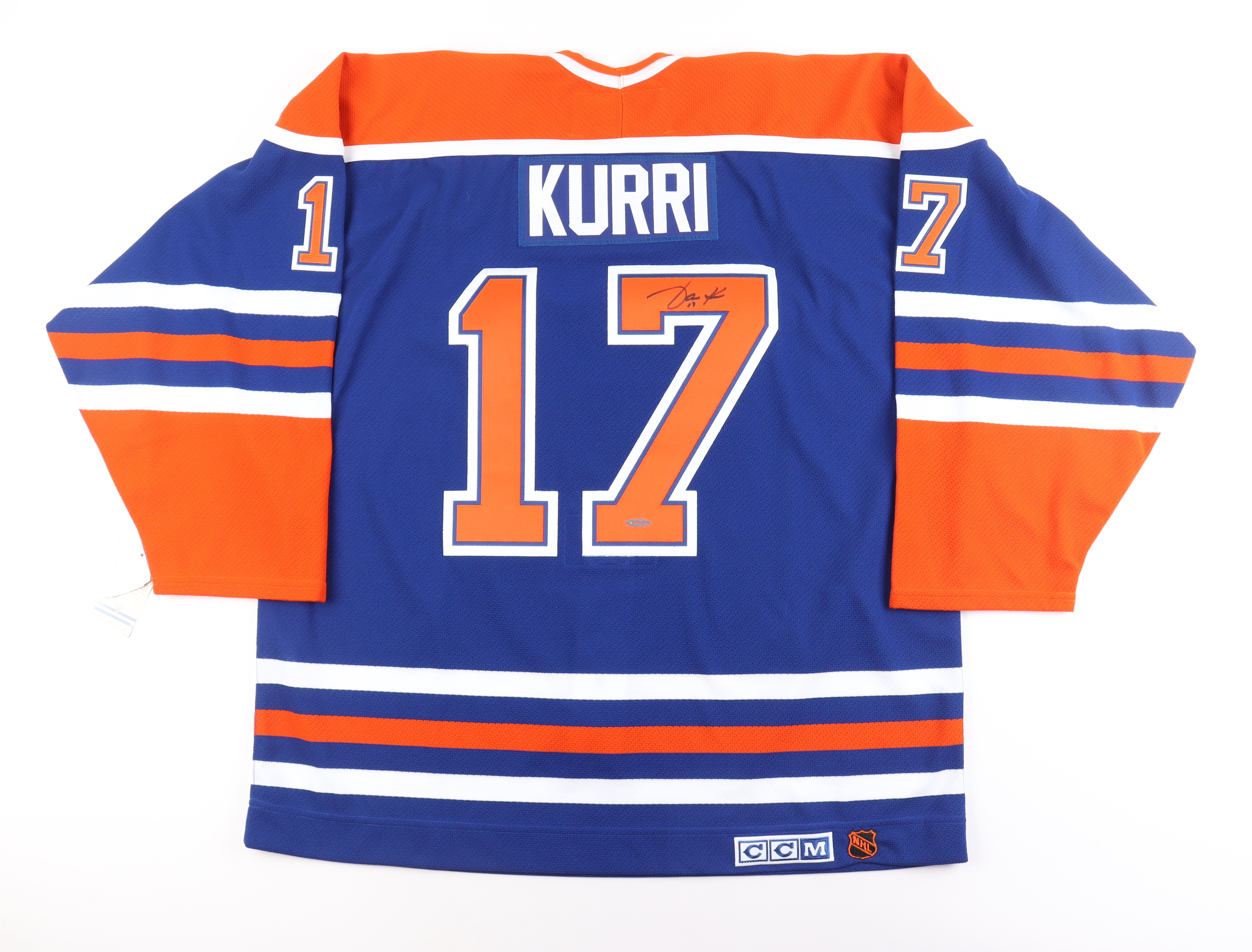 CCM jersey. Everything is sewn on, size 56. Has been hand-signed by Jari Kurri (Edmonton Oilers, HOF).