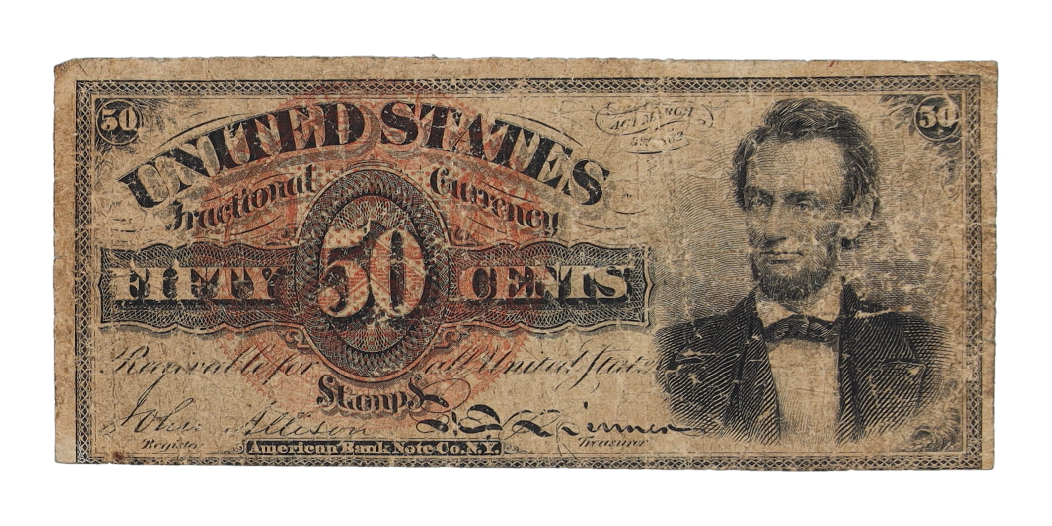 Fractional currency, also referred to as shinplasters, was introduced by the United States federal government following the outbreak of the Civil War. These fractional notes were in use between 21 August 1862 and 15 February 1876, and issued in 3, 5, 10, 15, 25, and 50 cent denominations across five issuing periods.