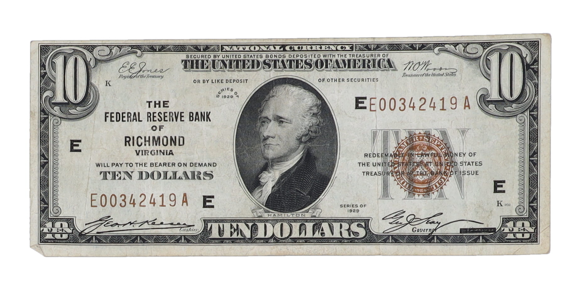 1929 $10 Ten Dollars U.S. National Currency Bank Note - Richmond