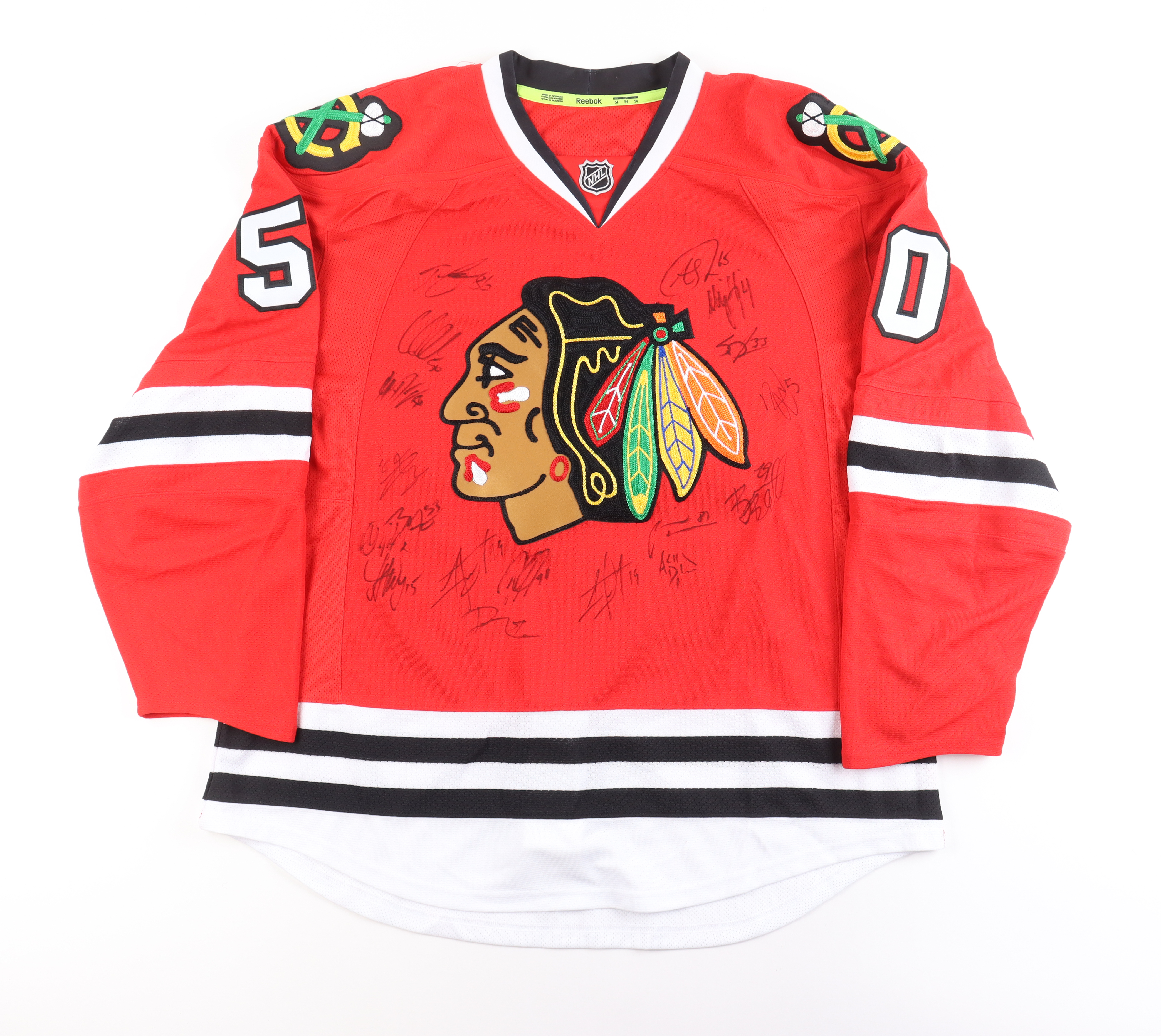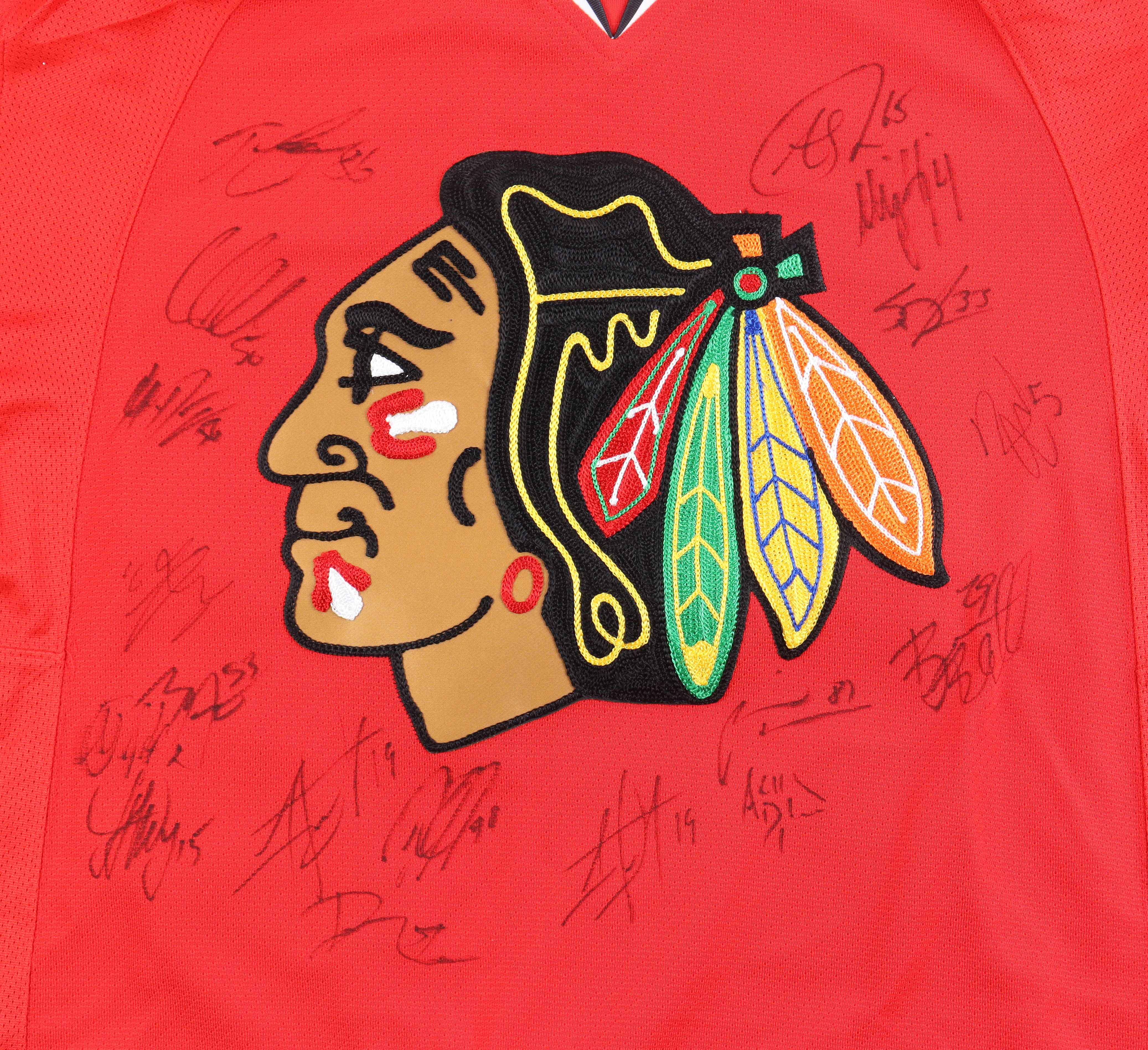 Reebok style jersey with everything sewn on, size 54. Jersey has been hand-signed by (18) members of the 2015 Stanley Cup Champions Blackhawks team! Signers include: