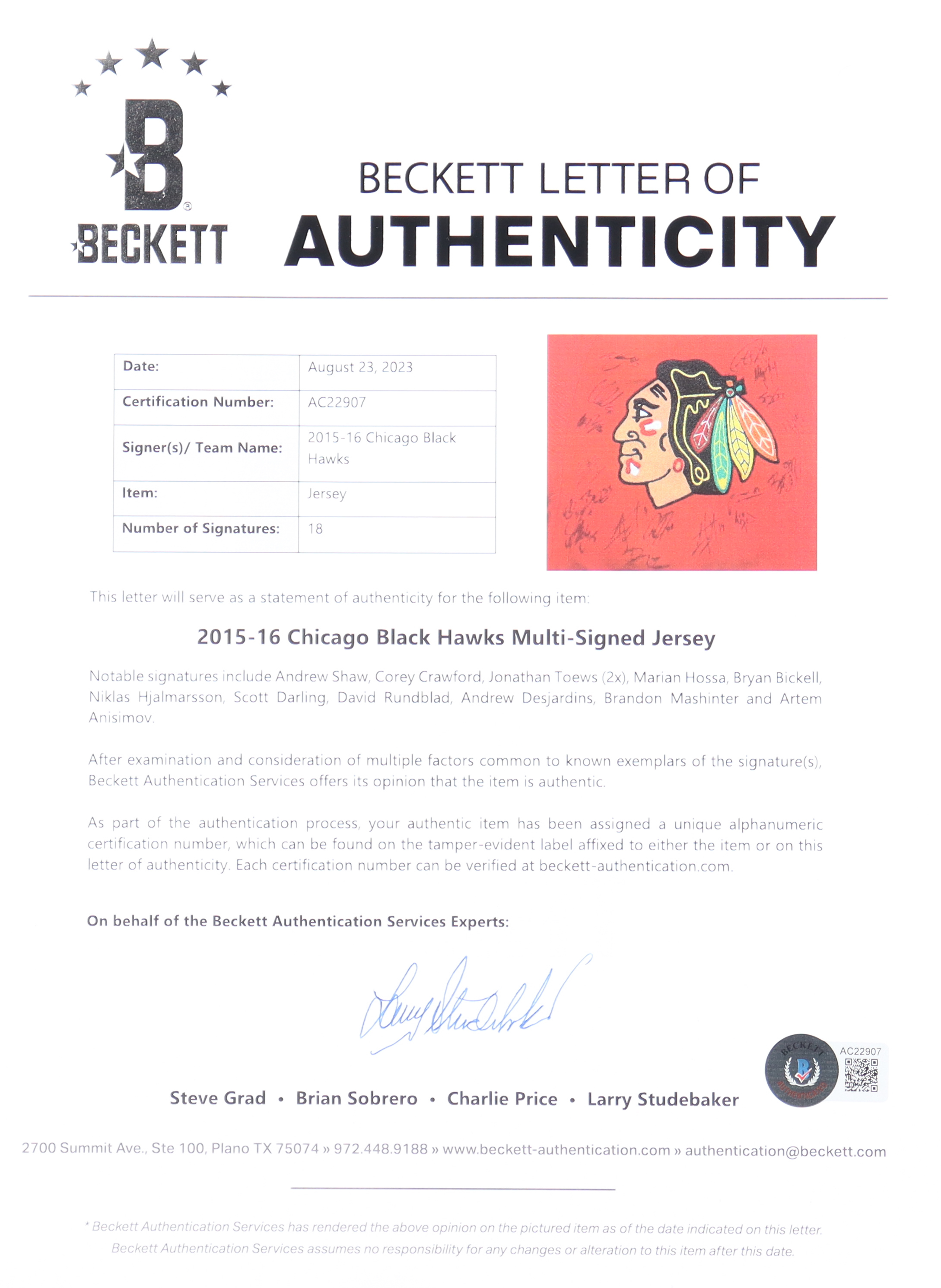 2015 Blackhawks Authentic Game Model Jersey Signed By (18) with Andrew Shaw, Corey Crawford, Jonathan Toews, Marian Hossa (Beckett)