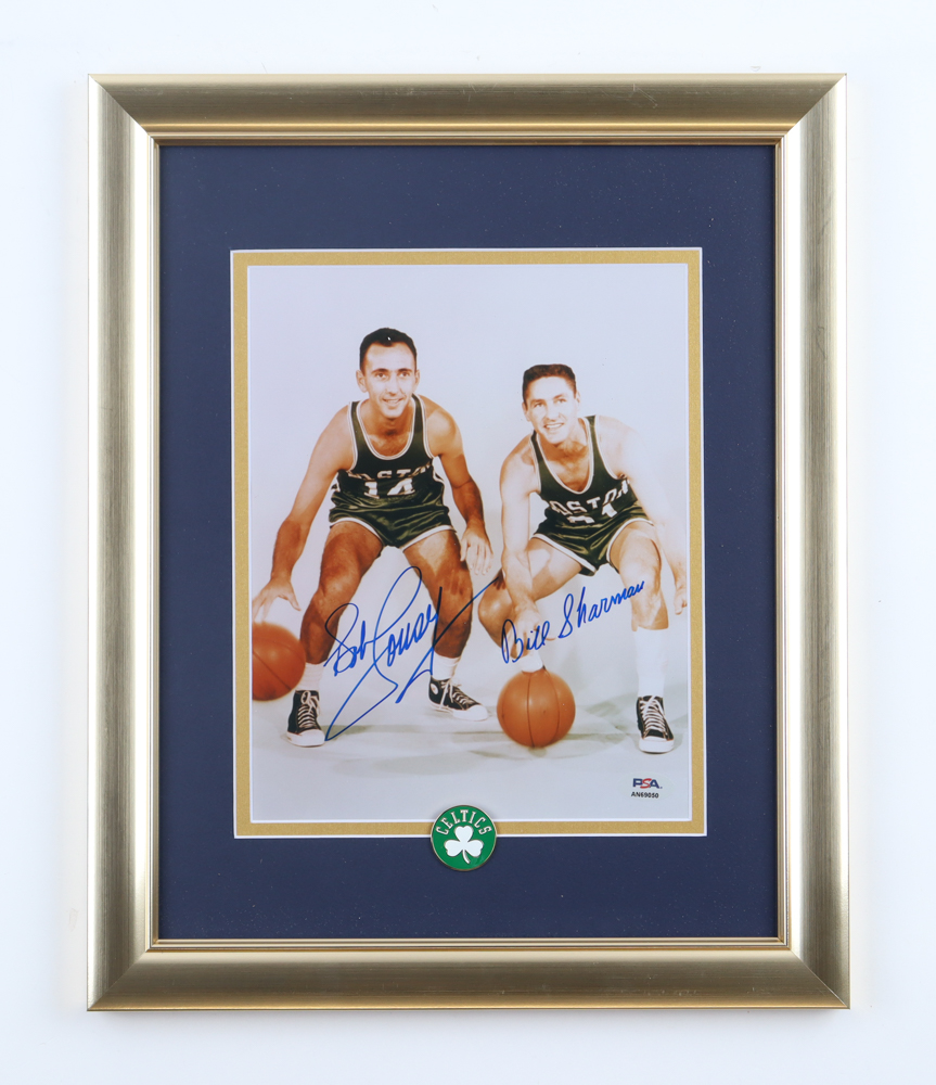 Custom framed display measures approximately 13" x 16" in size. Photo is hand-signed by Bob Cousy (HOF) & Bill Sharman (D. 2013, HOF). Includes a vintage Boston Celtics logo pin.