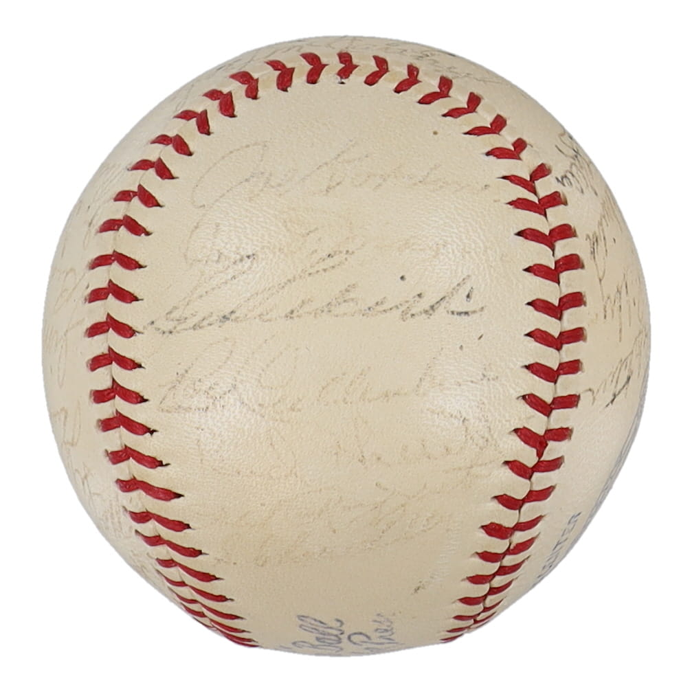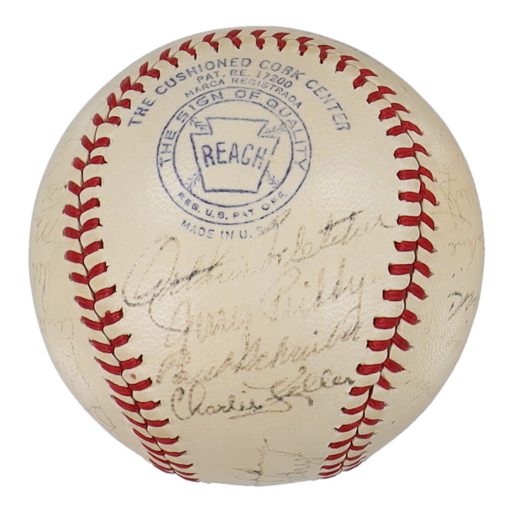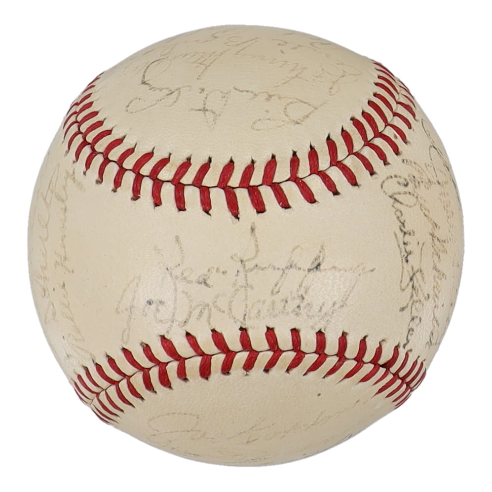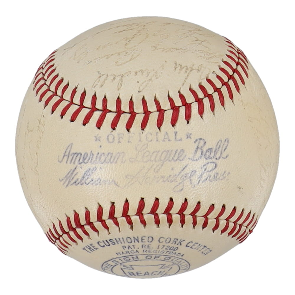 Reach Official American League baseball has been hand-signed by (29) with Red Ruffing, Joe Gordon, Joe DiMaggio, Bill Dickey, Lefty Gomez and (24) others. Includes original Reach box. Please note, the Joe McCarthy signature has been determined to be the clubhouse version. The baseball is naturally toned and some signatures are faded.