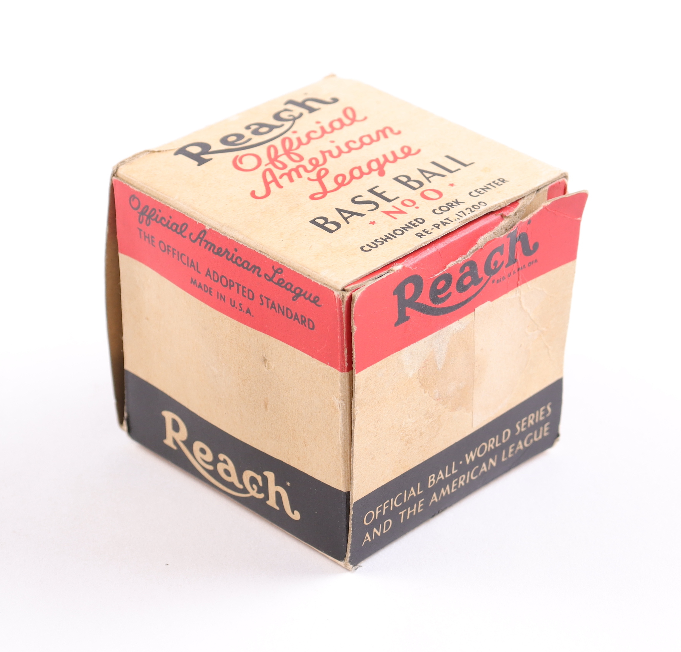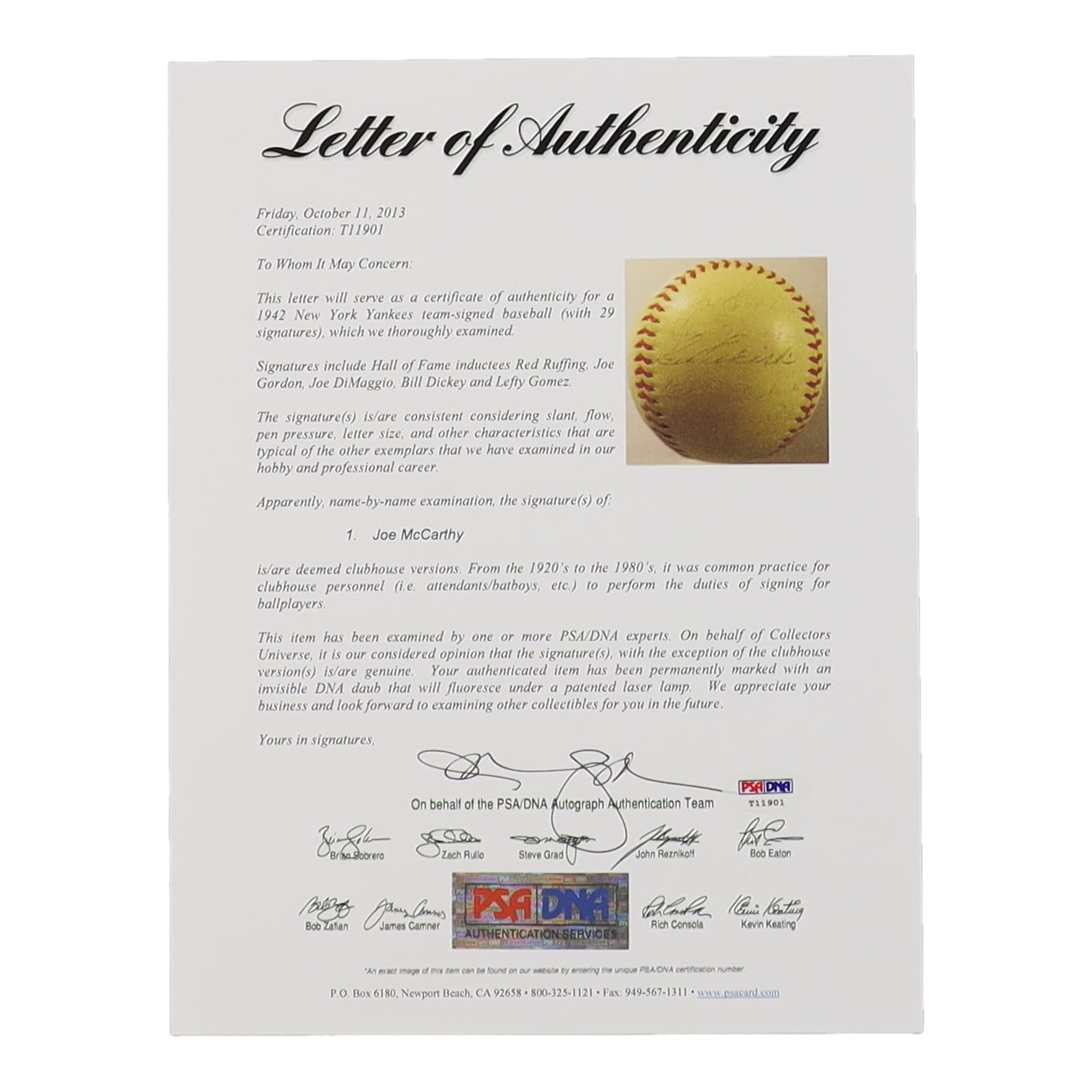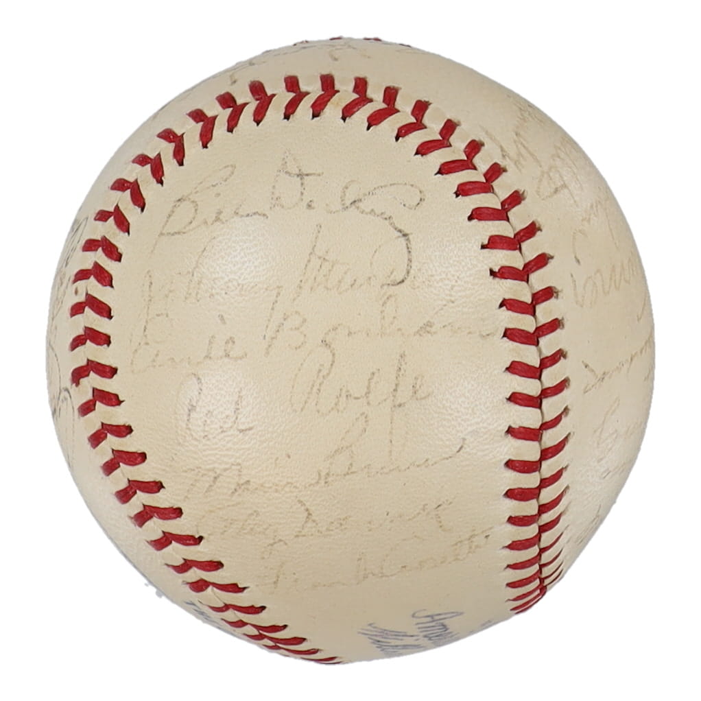 Reach Official American League baseball has been hand-signed by (29) with Red Ruffing, Joe Gordon, Joe DiMaggio, Bill Dickey, Lefty Gomez and (24) others. Includes original Reach box. Please note, the Joe McCarthy signature has been determined to be the clubhouse version. The baseball is naturally toned and some signatures are faded.