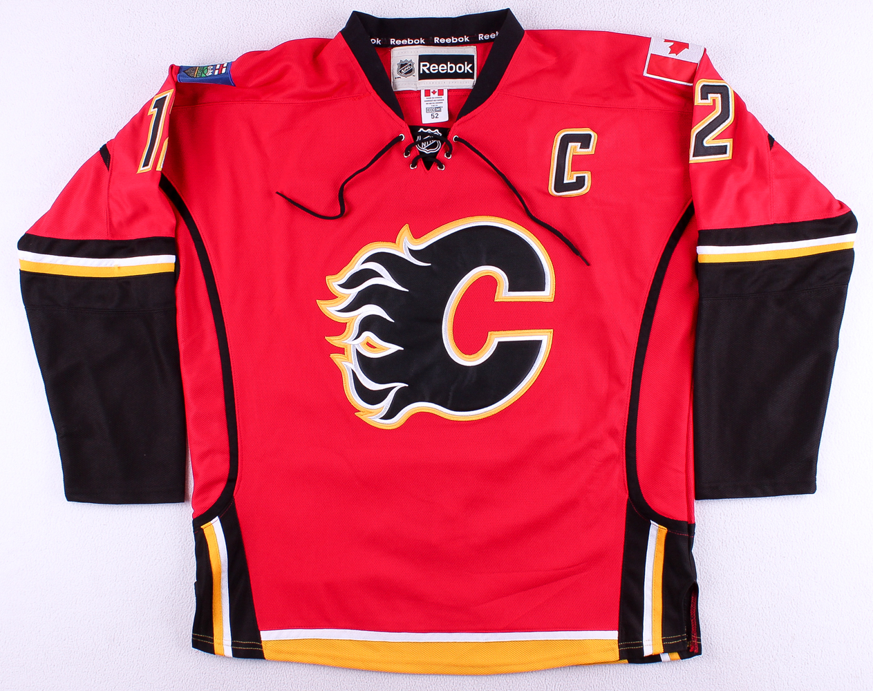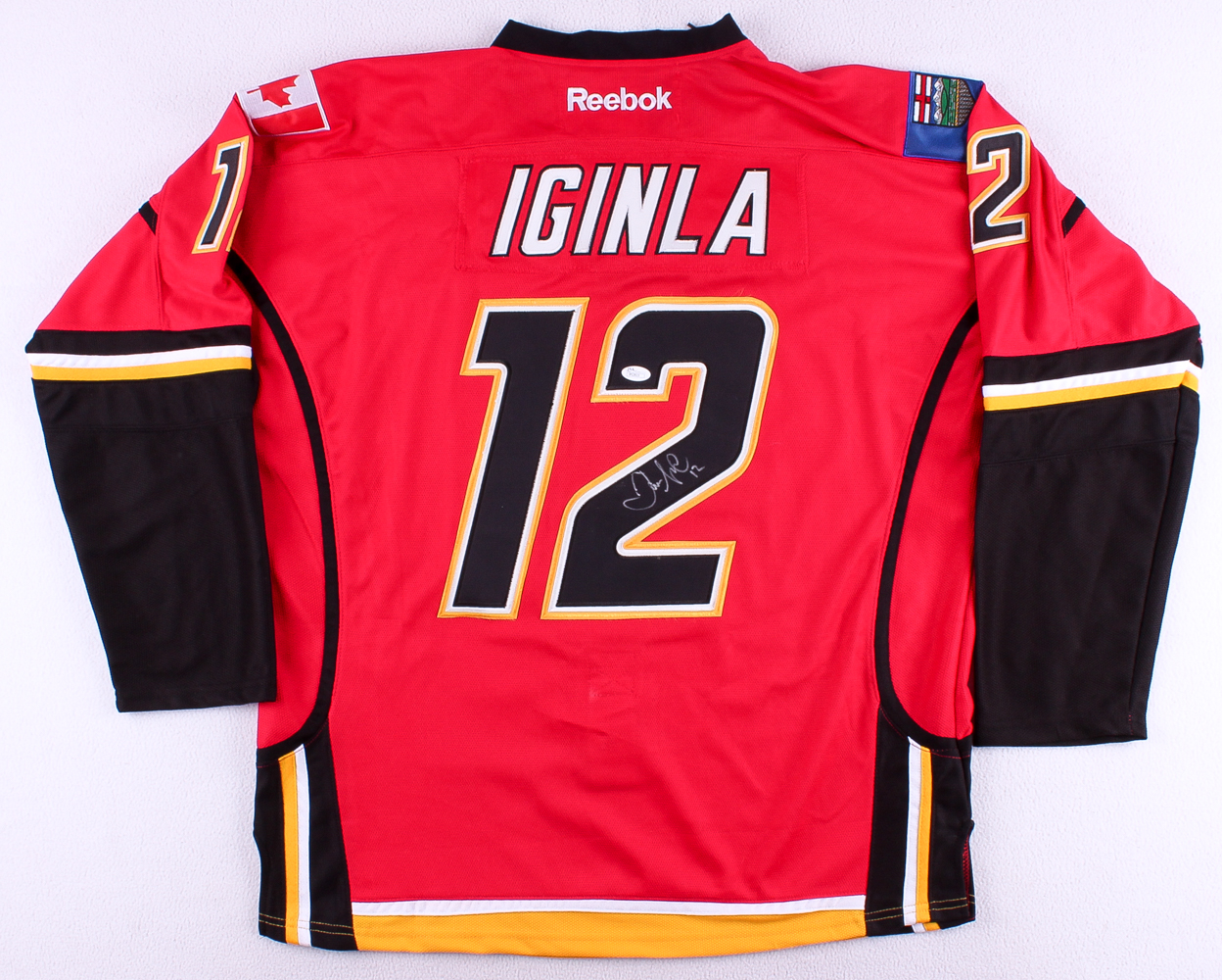 Reebok on-ice style jersey. Everything is sewn on, size 52. Hand-signed in silver paint pen by Jarome Iginla (Calgary Flames).