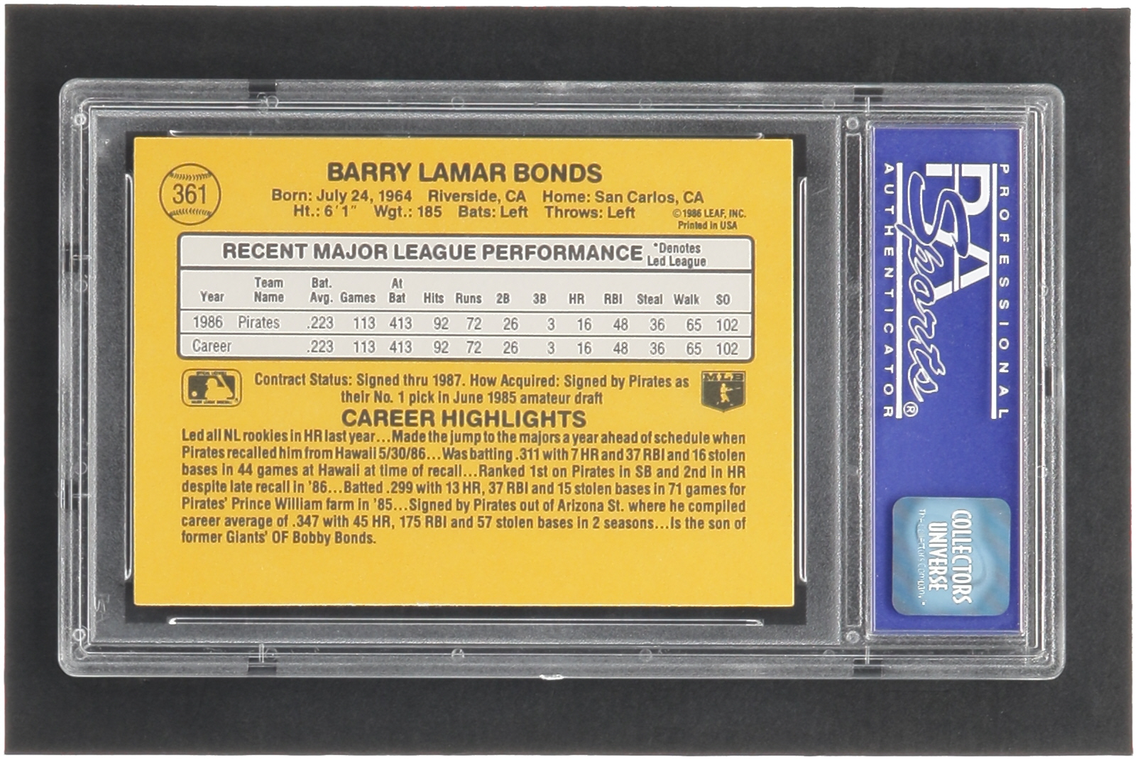 Barry Bonds 1987 Donruss #361 RC (PSA 9)