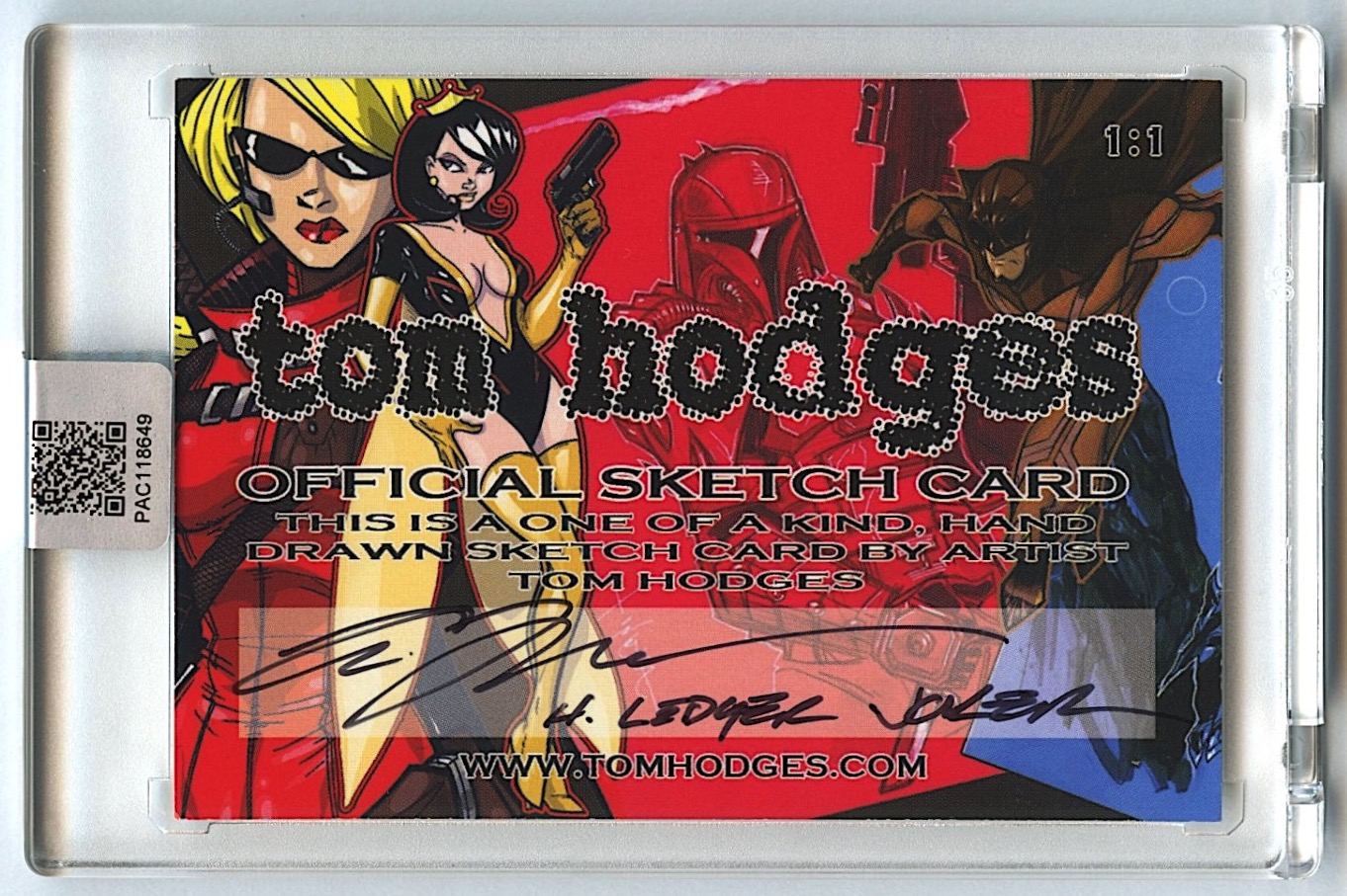 This original sketch card includes original art by renowned comic book artist, Tom Hodges. Also includes a character name inscription on the back by the artist.