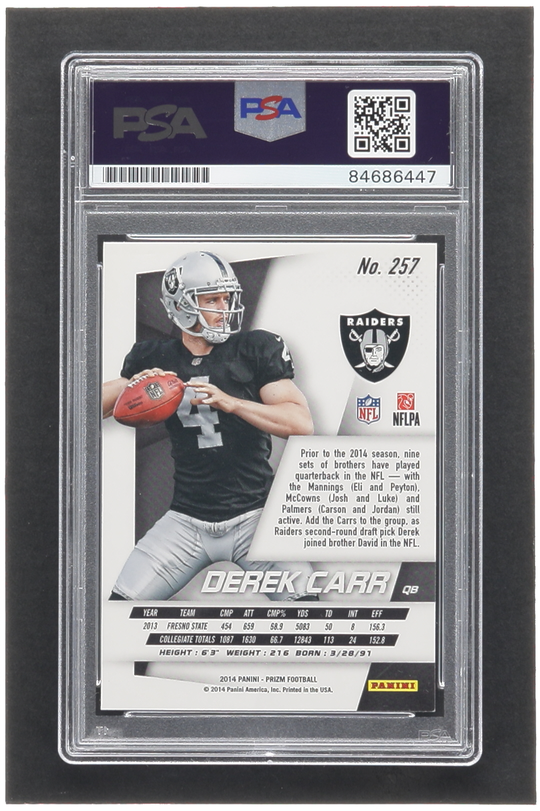 Derek Carr Signed 2014 Panini Prizm #257A RC (PSA)