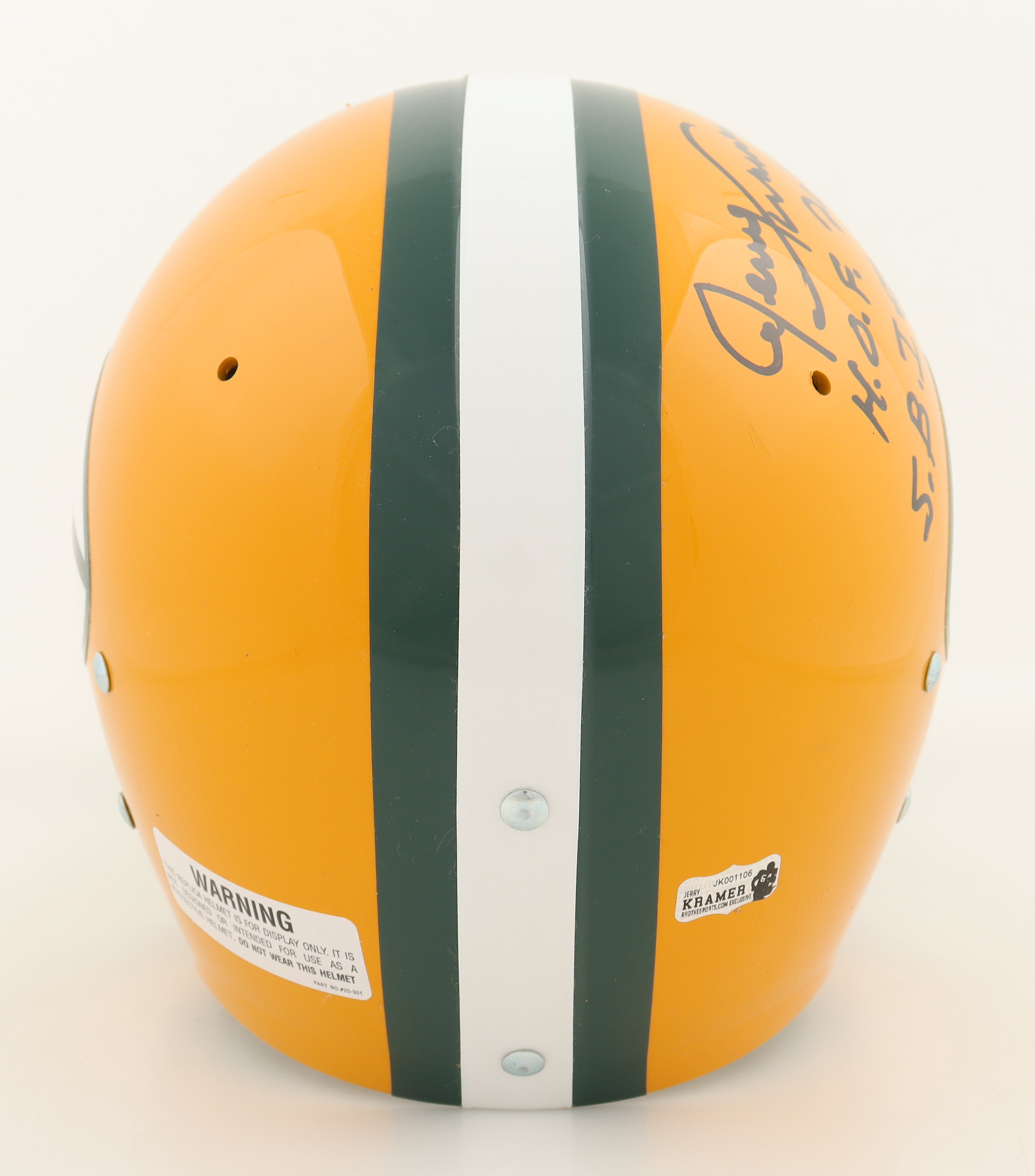 Riddell Green Bay Packers full-size replica helmet. Hand-signed and inscribed by Jerry Kramer (HOF).