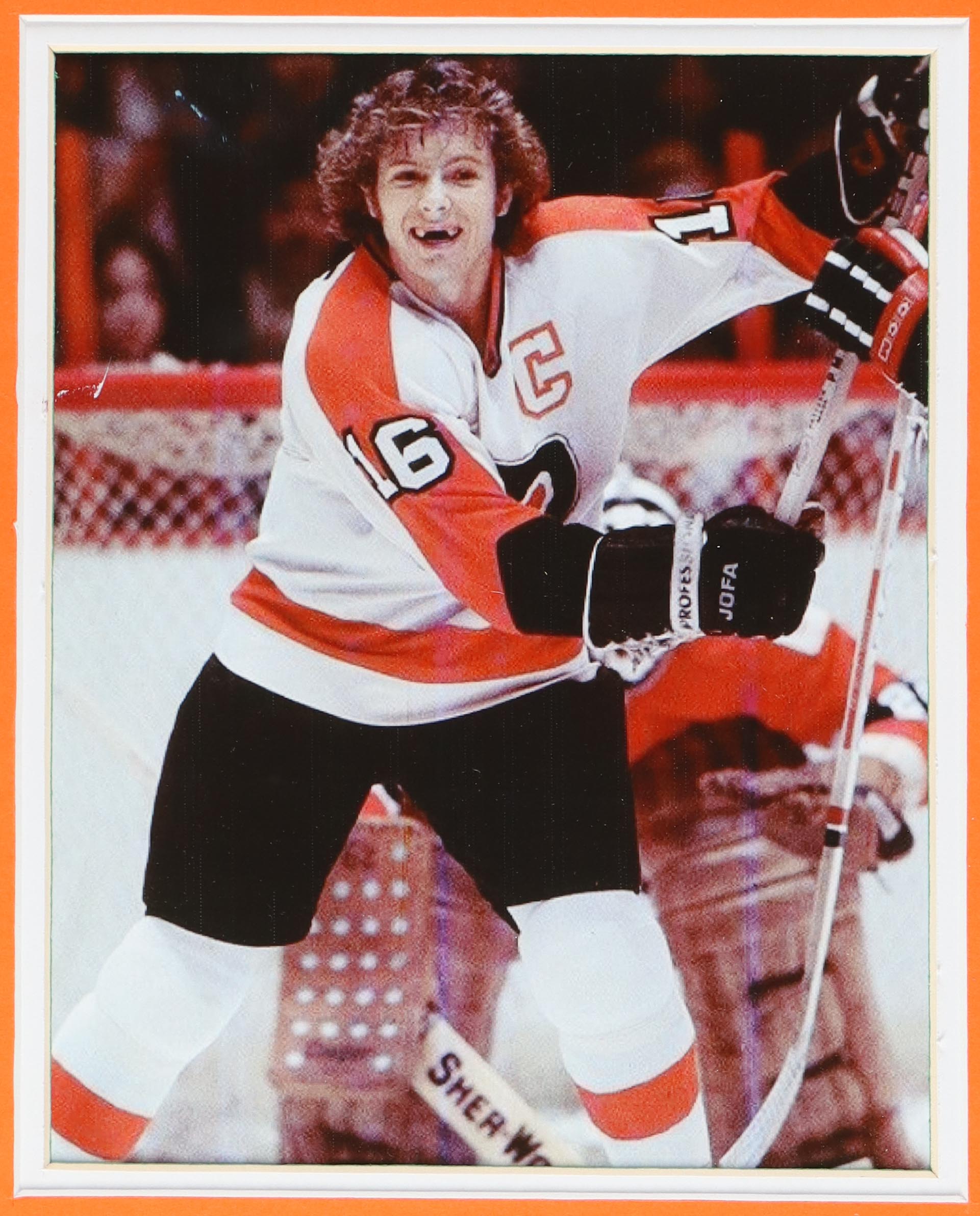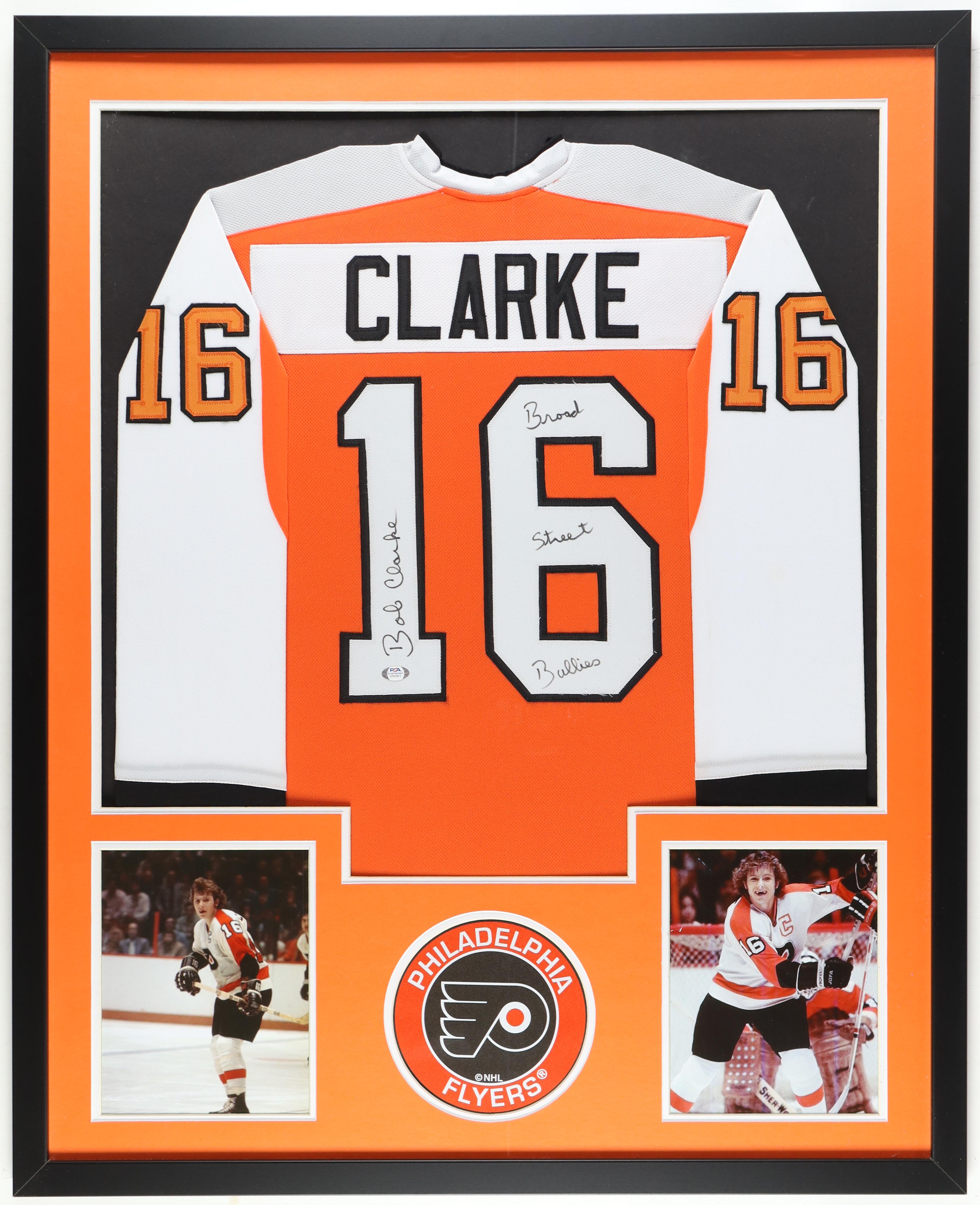 Custom frame measures approximately 34" x 43" in size and features a jersey that has been hand-signed and inscribed by Bobby Clarke (Philadelphia Flyers, HOF).