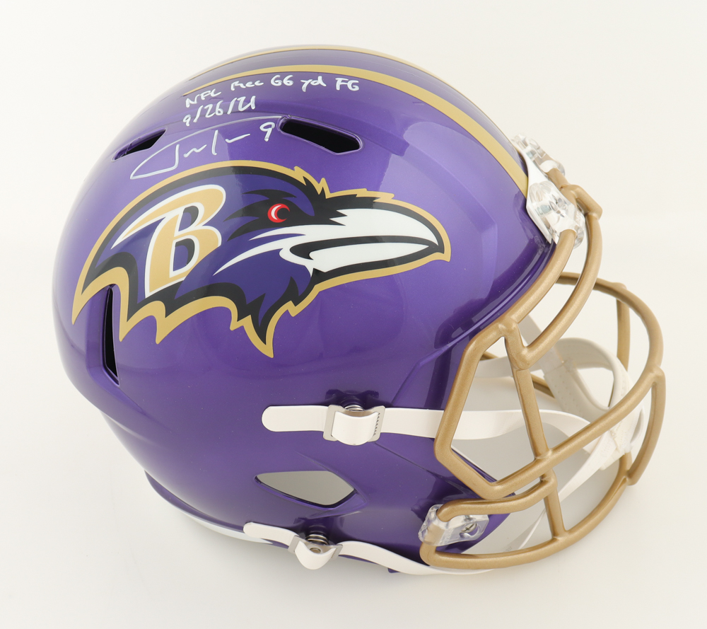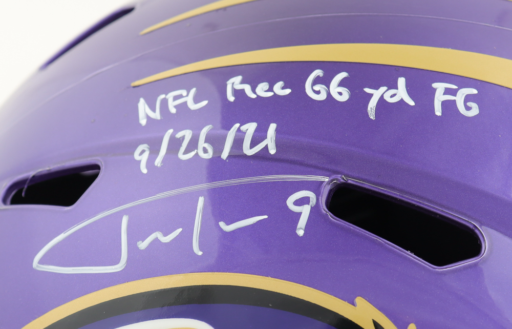 Justin Tucker Signed Ravens Full-Size Flash Alternate Speed Helmet Inscribed "NFL Rec 66 YD FG 9/26/21" (JSA)