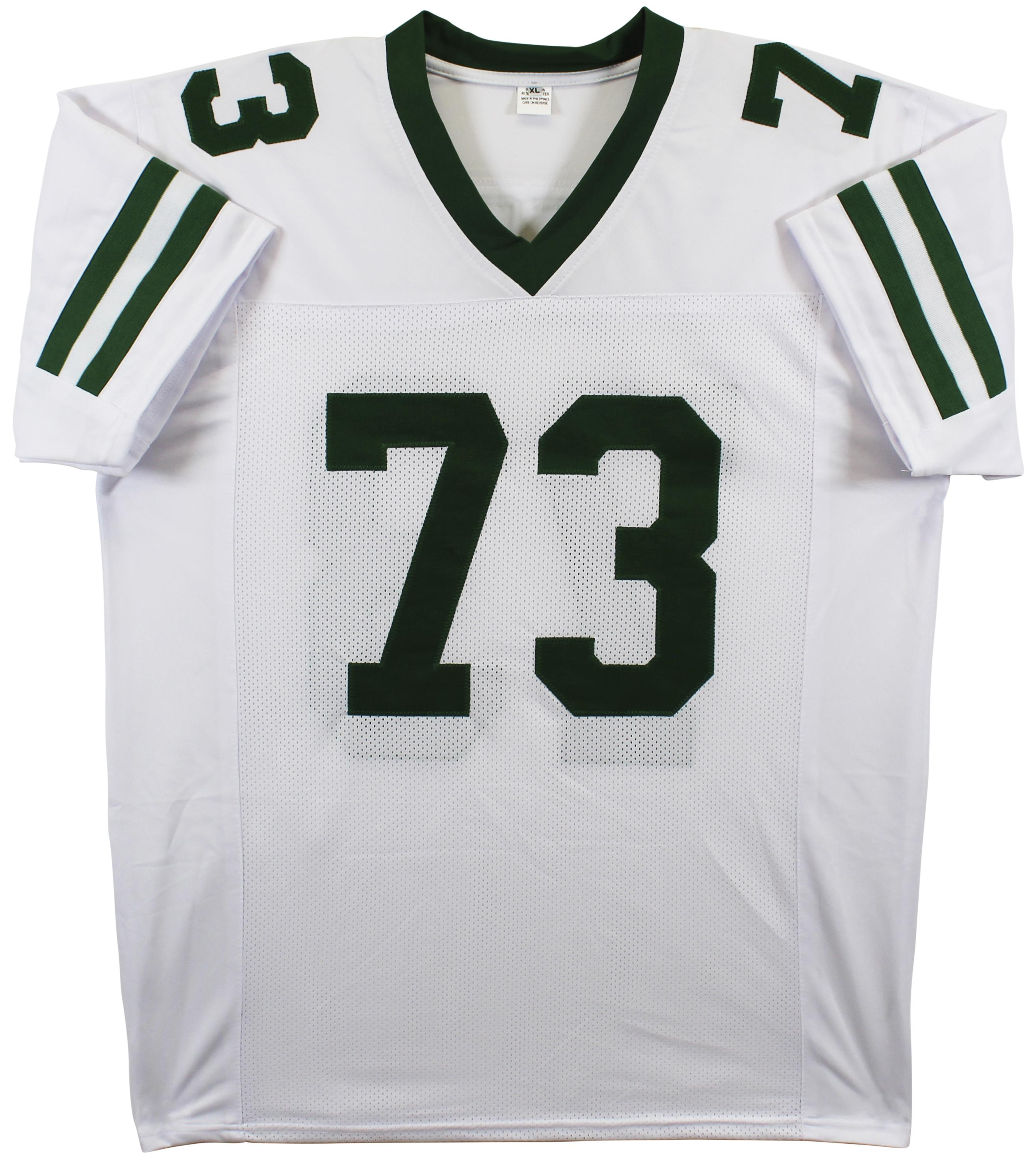 Custom jersey with everything sewn on, size XL. Hand-signed and inscribed by Joe Klecko (HOF).