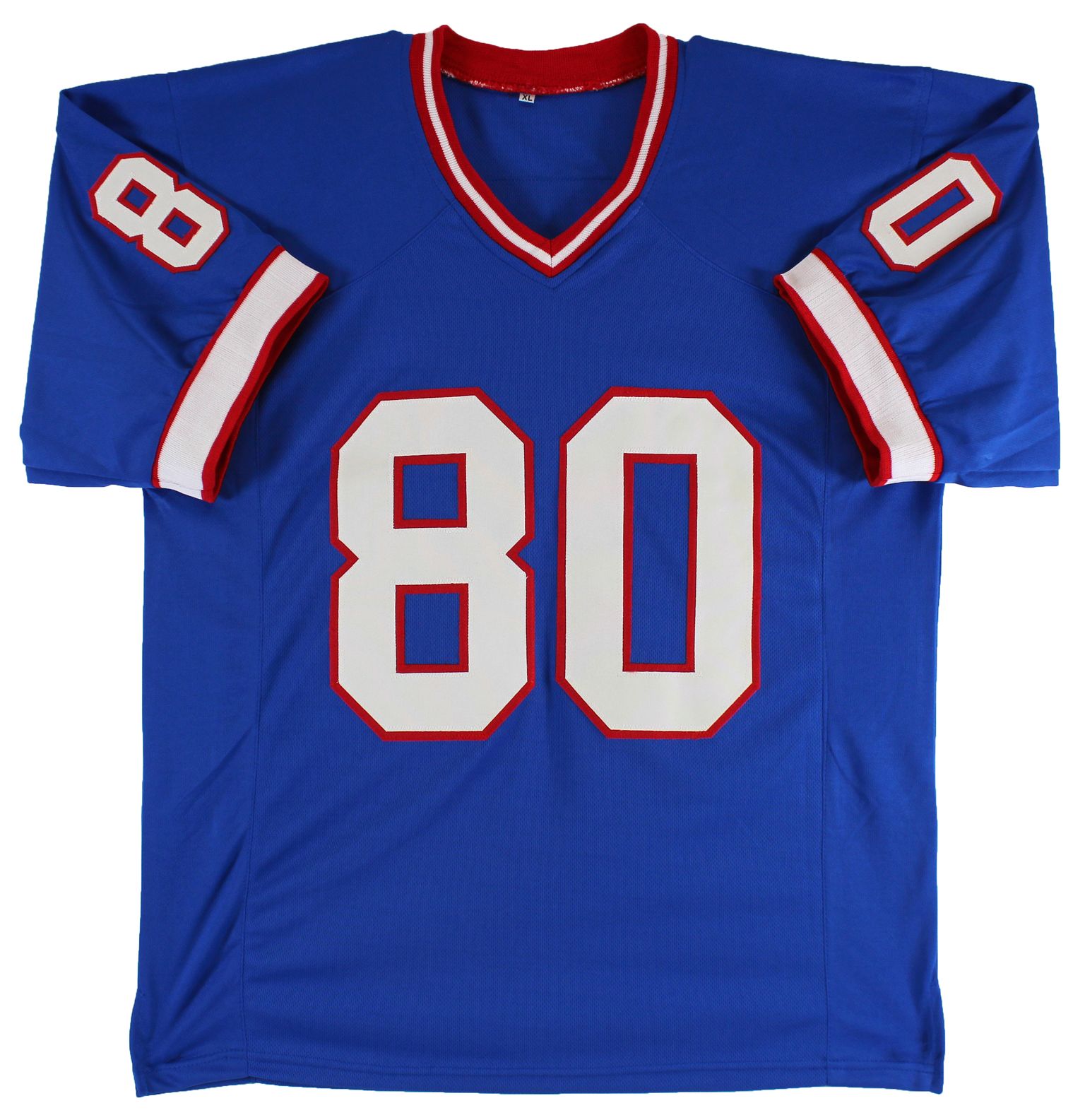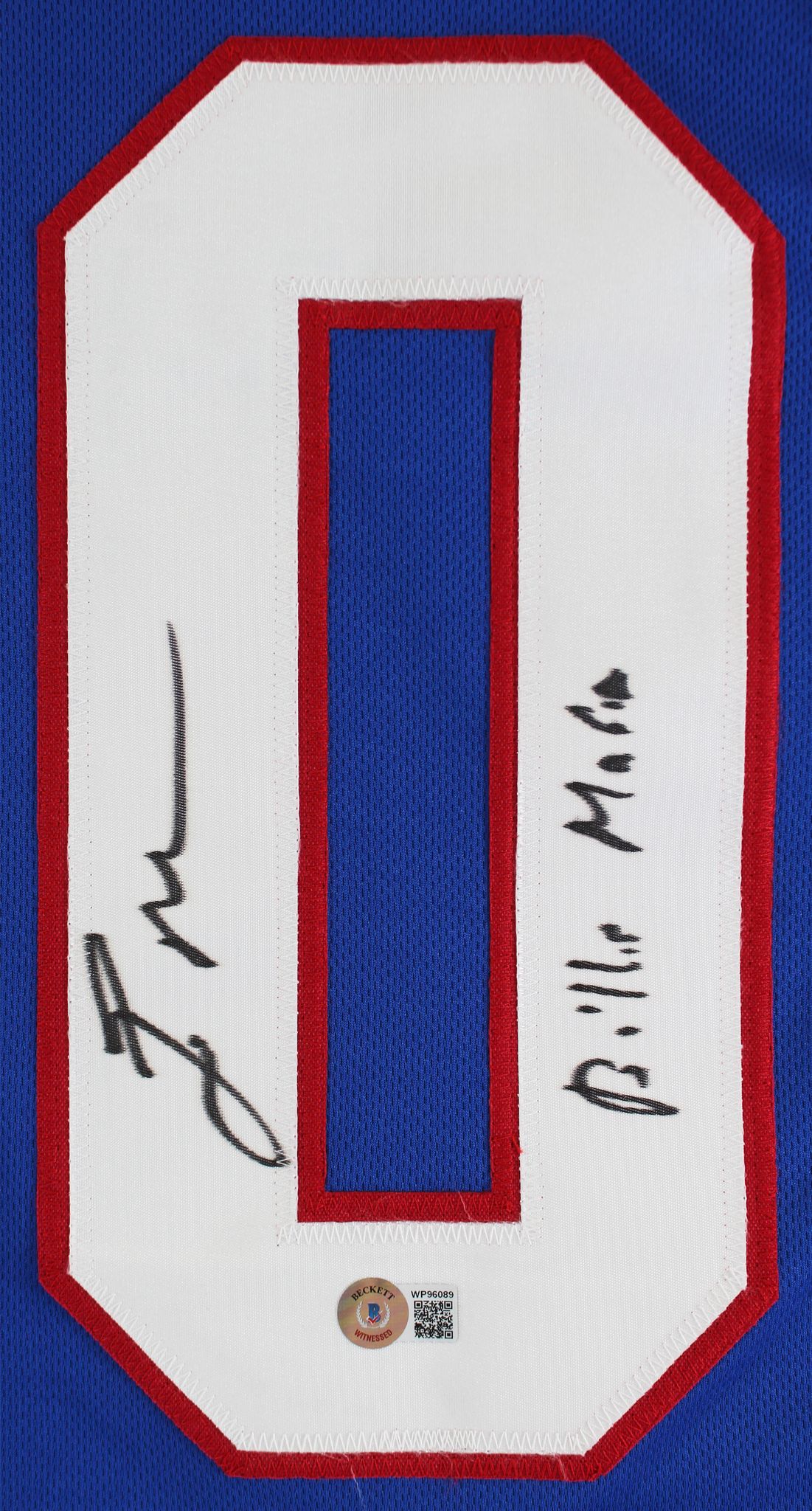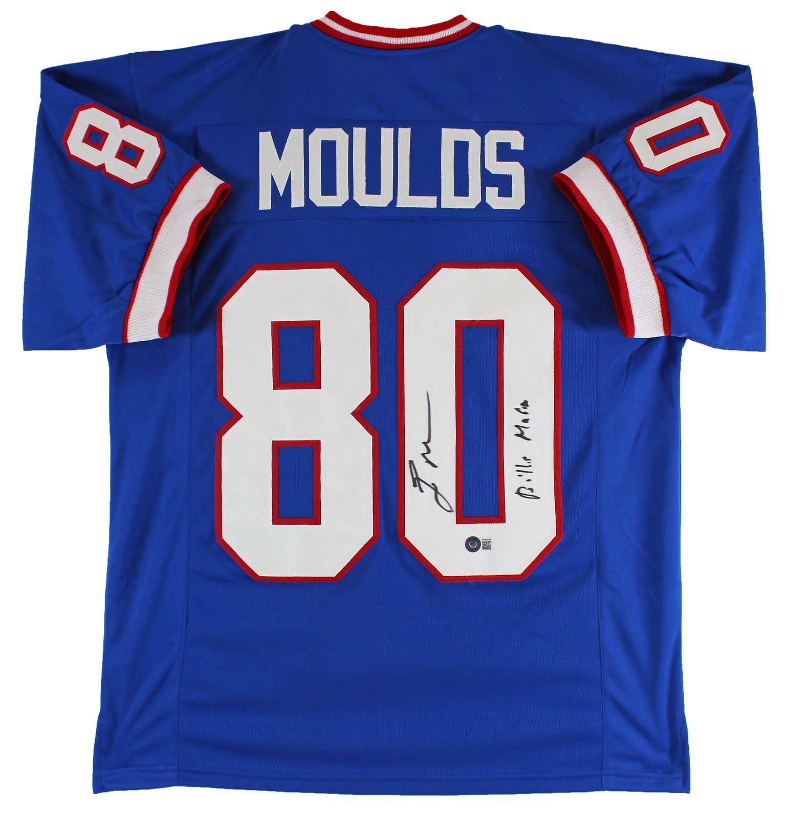 Custom jersey. Everything is sewn on, size XL. Hand-signed and inscribed by Eric Moulds.