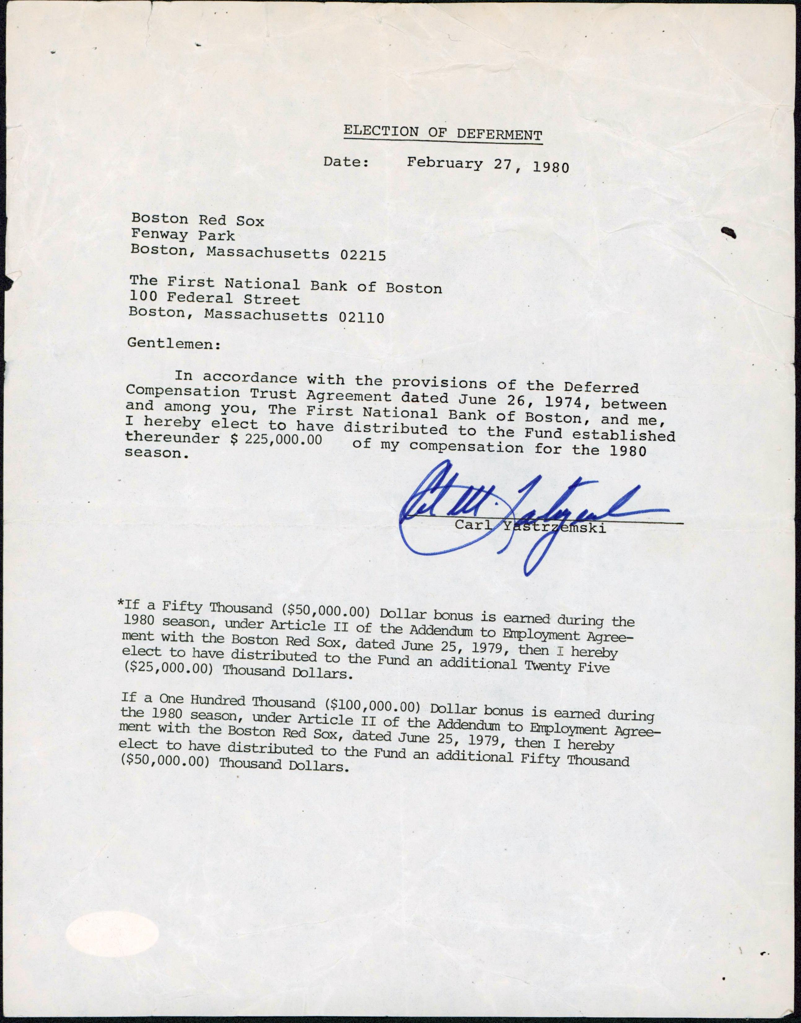 February 27th, 1980 Letter has been hand-signed by Carl Yastrzemski (Boston Red Sox, HOF).