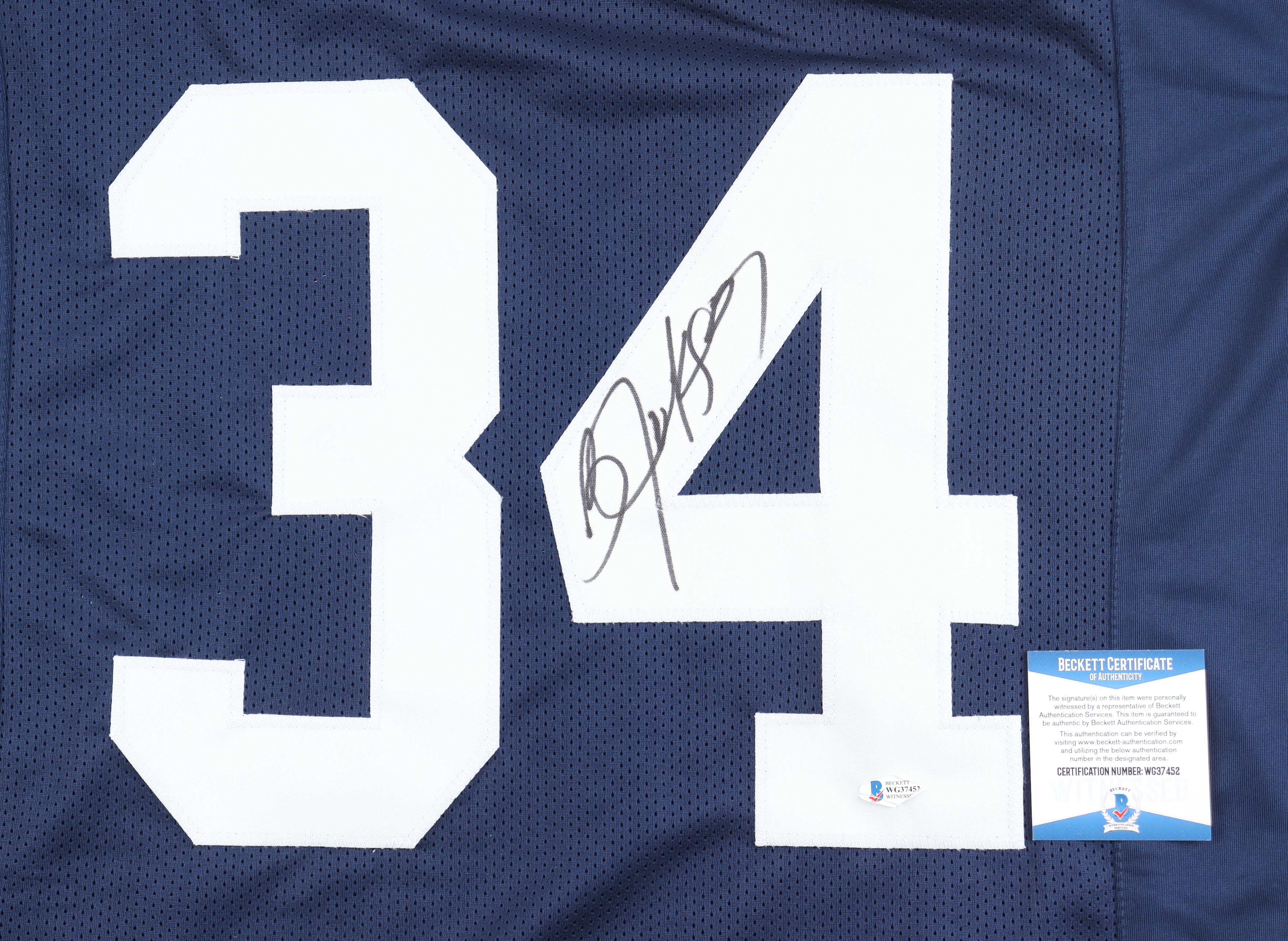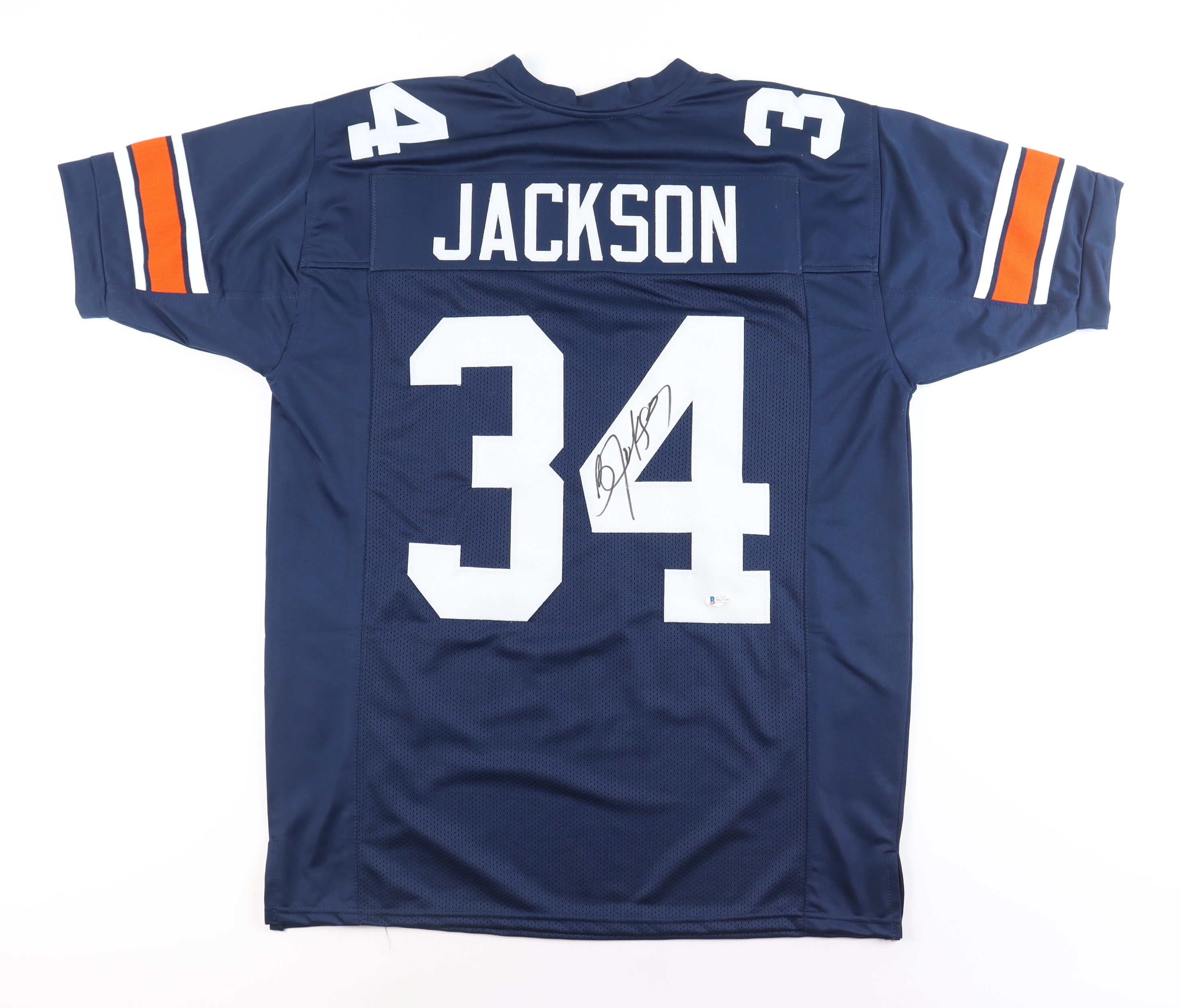 Custom football jersey. Everything sewn on, size XL. Hand-signed by Bo Jackson.