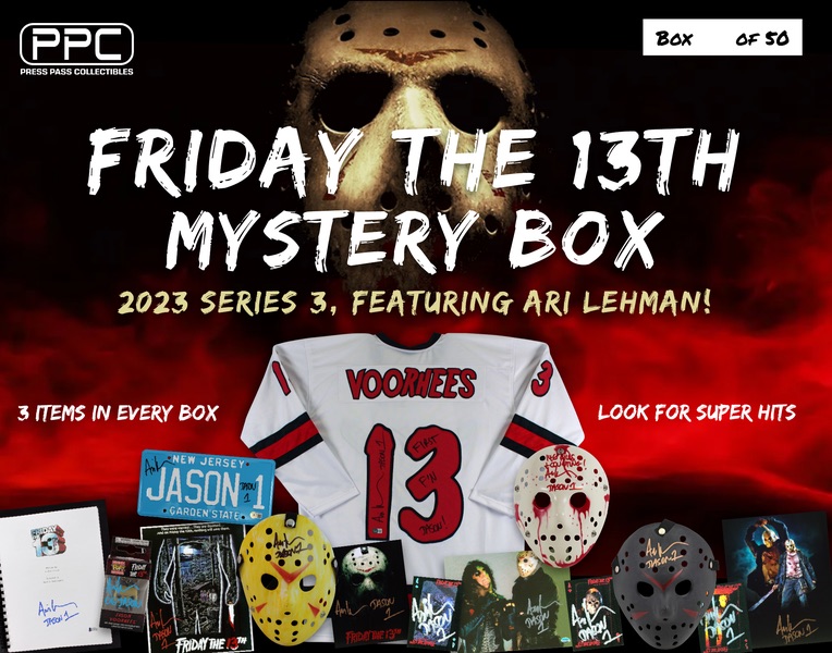 "The Press Pass Collectibles 2023 ""Friday the 13th"" Ari Lehman Mystery Box is limited to 50 boxes. Each box will include three (3) autographed items. Each box is guaranteed to have one (1) autographed 8x10 and one (1) signed Jason mask. The last item in each box will contain a combination of autographed jerseys, playing cards, license plates, & movie scripts. This is a perfect gift for Friday the 13th fans or all who love horror!