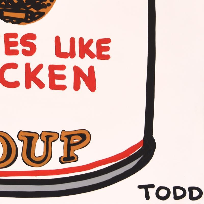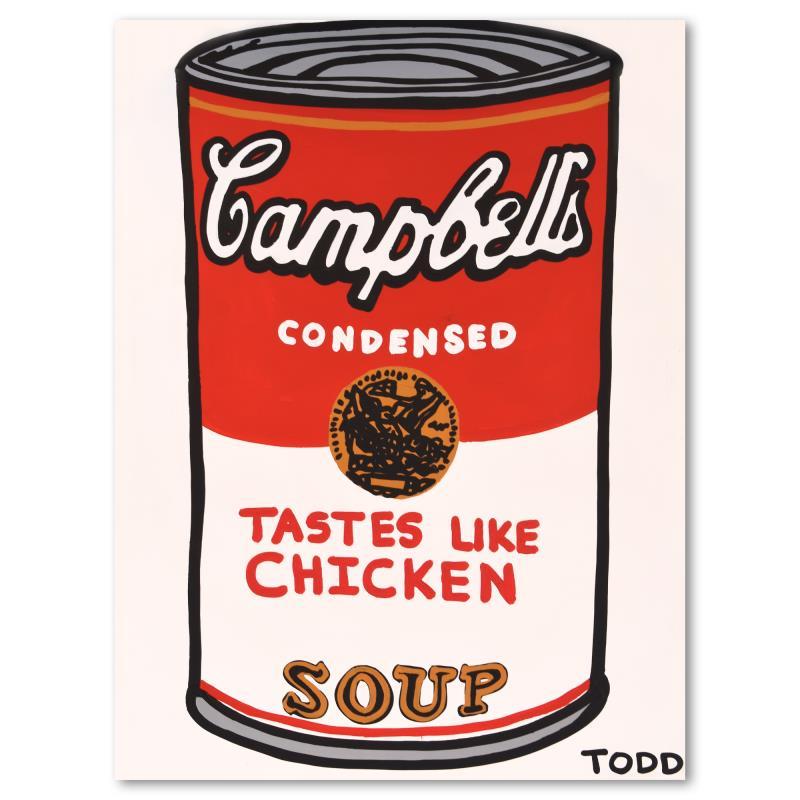 "Tastes Like Chicken" is an original acrylic painting on gallery wrapped canvas by Todd Goldman, hand-signed by the artist. Includes Letter of Authenticity. Measures approx. 36" x 48" (image). Due to the way this piece was stored there may be minor wear or signs of age (such as wear on the corners) but the piece is in overall good condition.