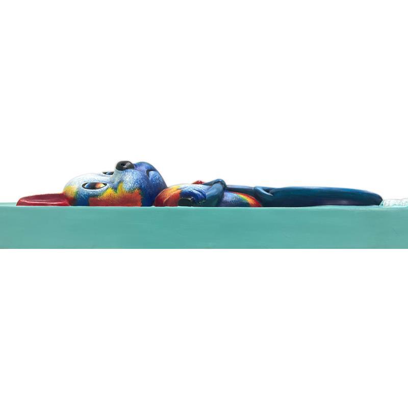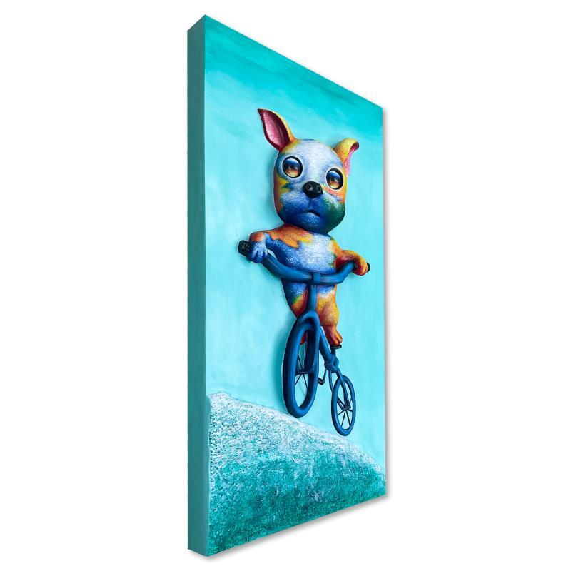 "Bike Psych" is a hand painted limited edition dimensional bas relief sculpture by Wang. This piece is numbered 1/3 and hand signed inverso. Includes Letter of Authenticity. Measures approx. 39" x 19.5" x 6". There is a small hairline crack on the surface behind the left handlebar that is only visible upon very close inspection.