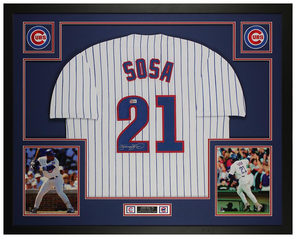 Custom frame measures 35” x 43” in size and features a jersey that has been hand-signed by Sammy Sosa.