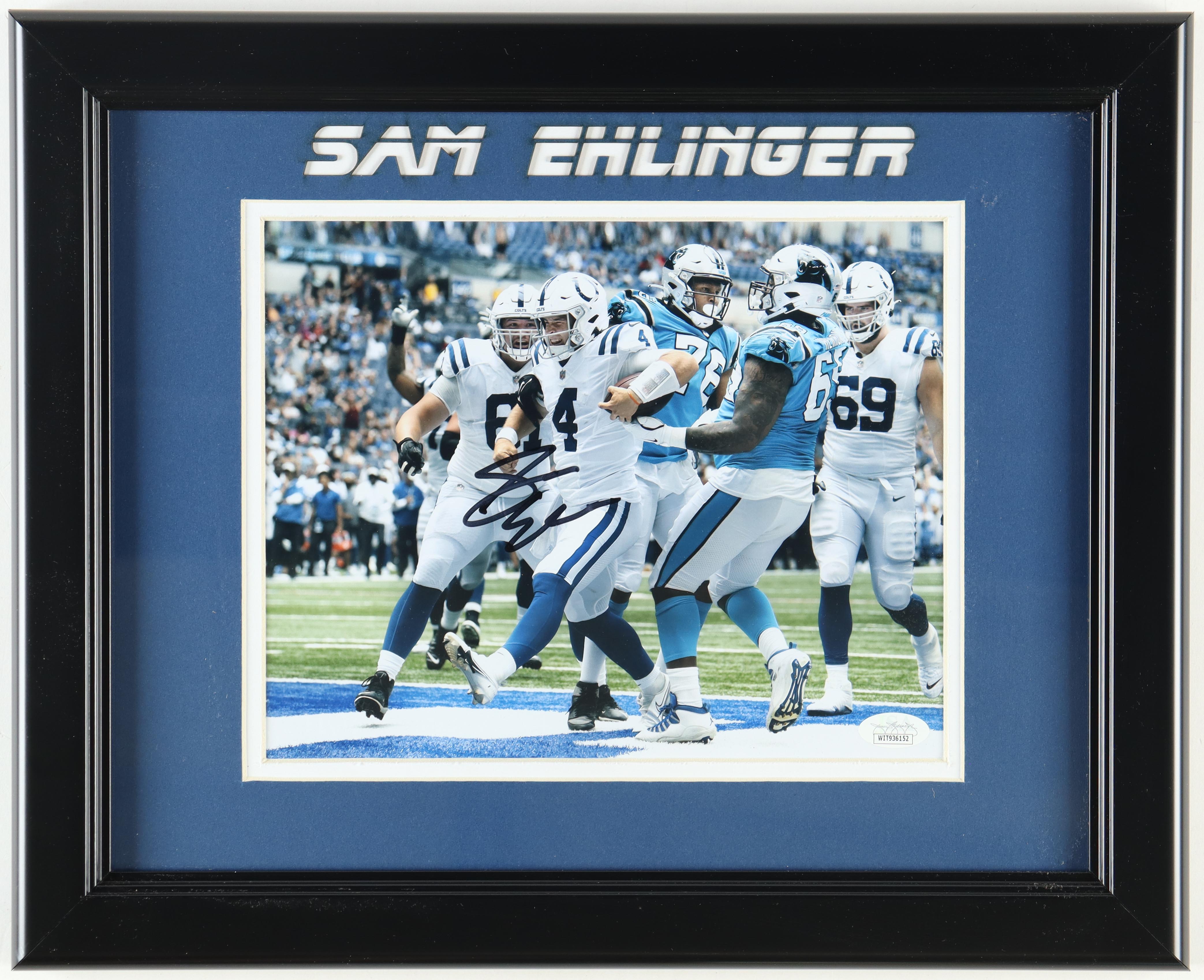 Custom frame measures approximately 13.5" x 16.5" in size and features a photo hand-signed by Sam Ehlinger (Indianapolis Colts). Please note, there is scuffing on the frame borders.