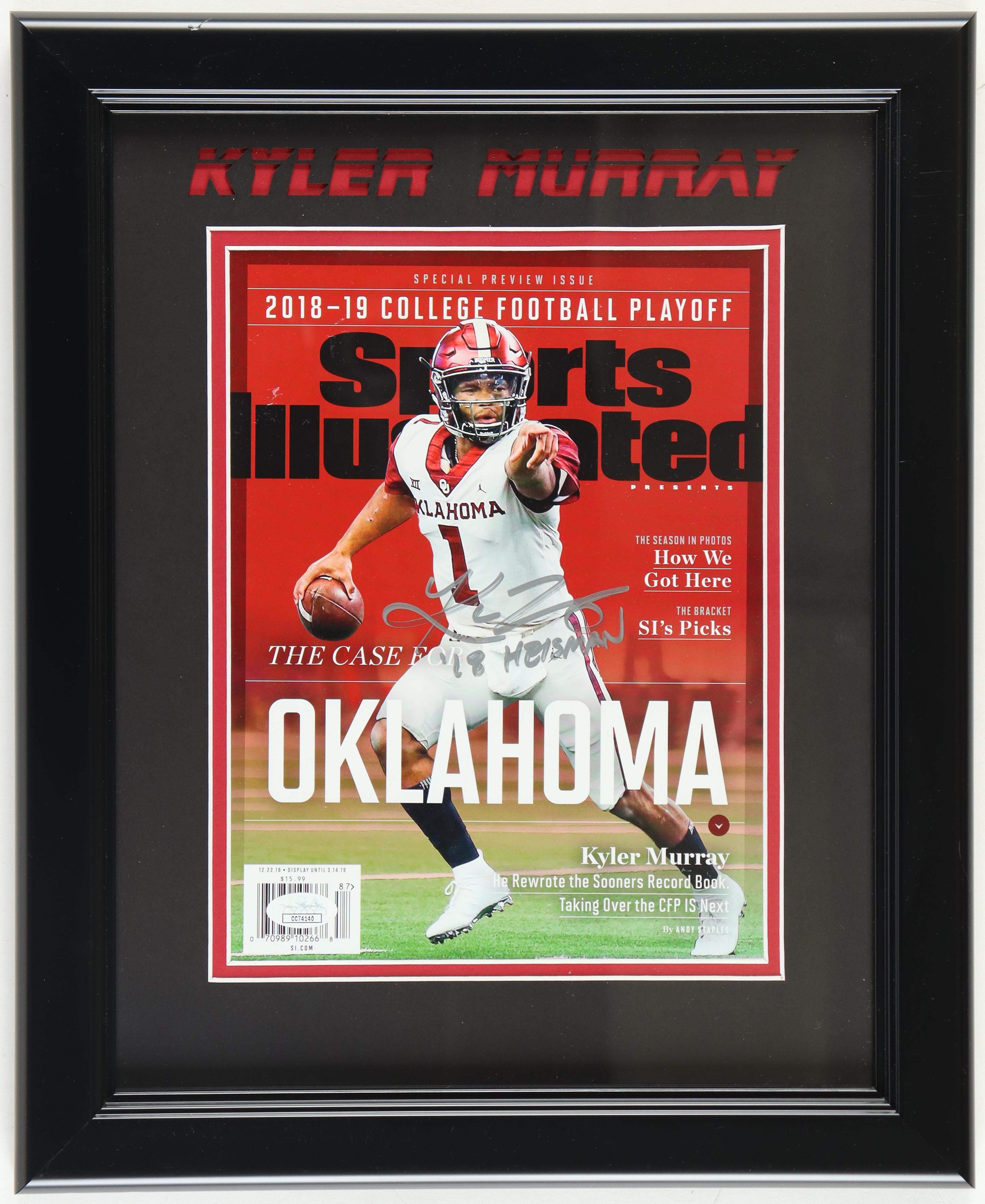 Custom frame measures approximately 13.5" x 16.5" in size and features a 2018 "Sports Illustrated" magazine cover that has been hand-signed and inscribed by Kyler Murray (Oklahoma Sooners).