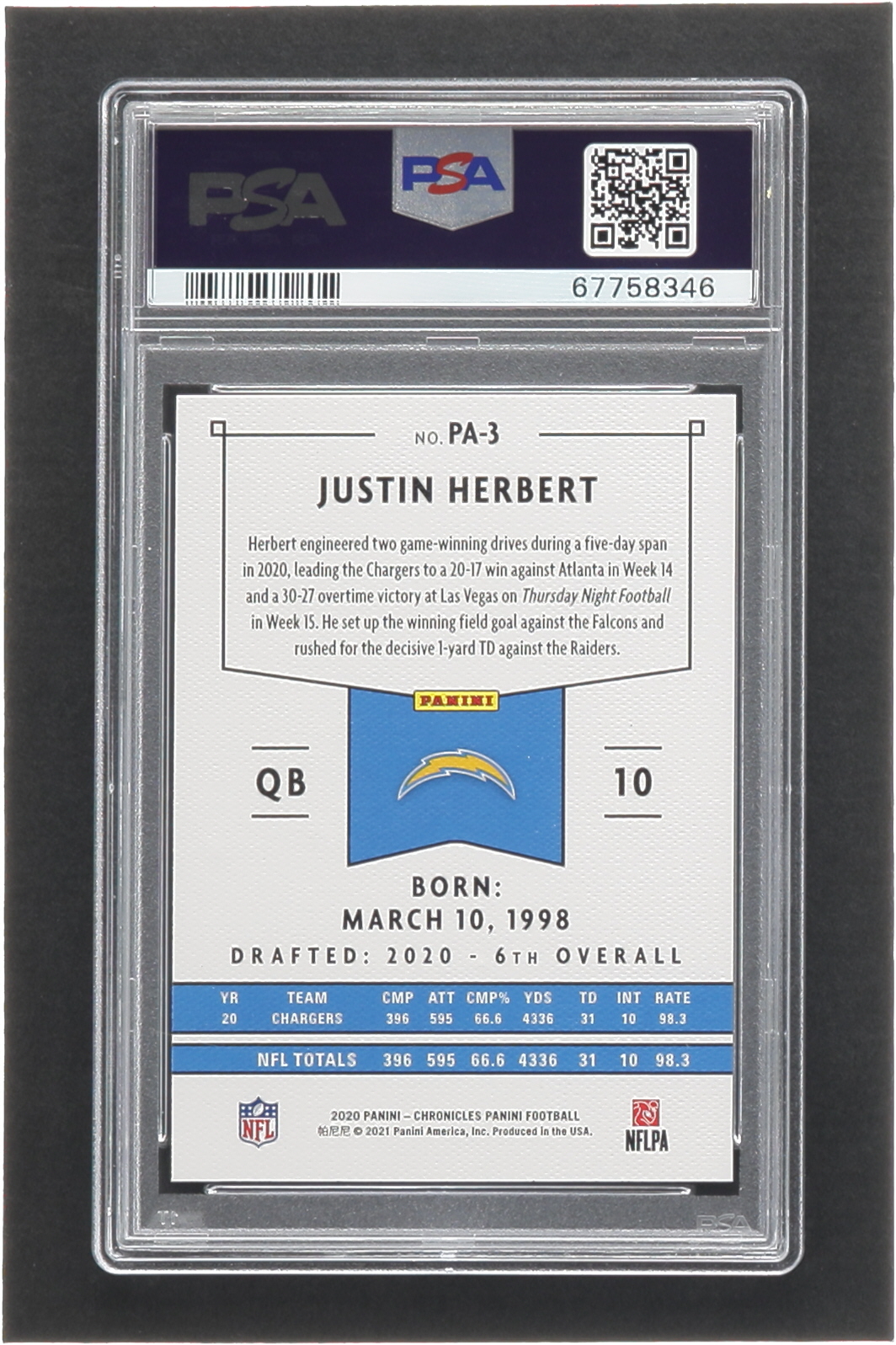 Justin Herbert 2020 Panini #3 RC (PSA 10)
