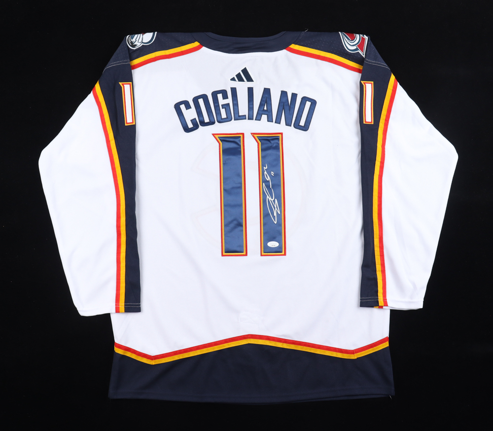 Custom jersey with everything sewn on, size 54. Hand-signed by Andrew Cogliano.