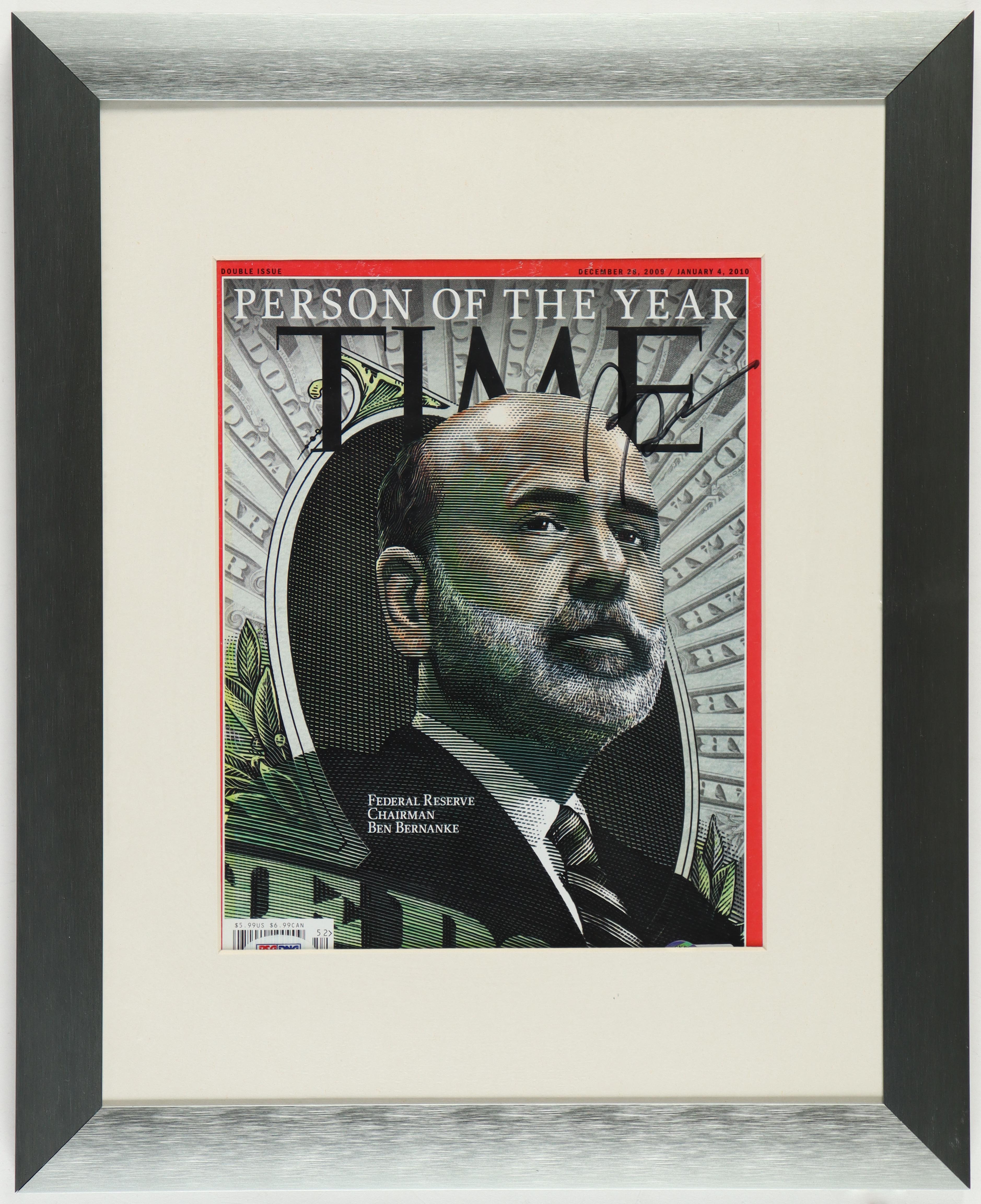 Custom frame measures approximately 13" x 16" in size and features a "Time: Person Of the year" magazine from December 28, 2009 that has been hand-signed by Ben S. Bernanke