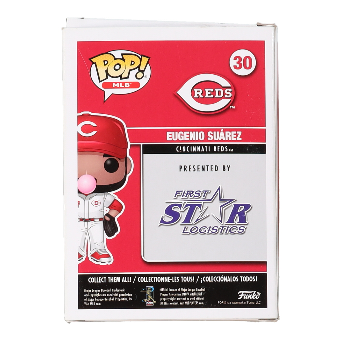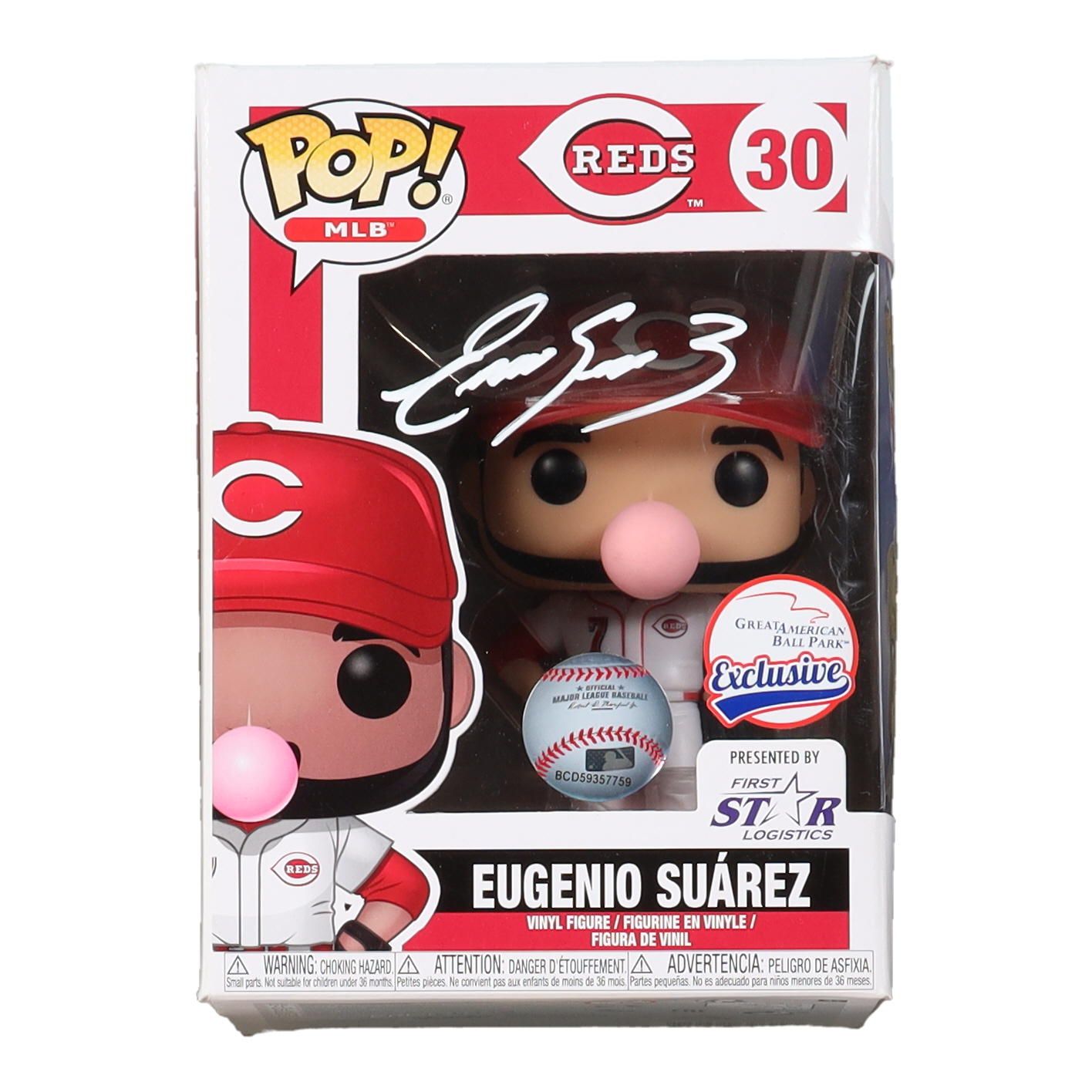 Funko Pop! vinyl figure measures 4" in height and has been hand-signed on the packaging by Eugenio Suarez (Cincinnati Reds). Please note, the packaging window has minor damage.