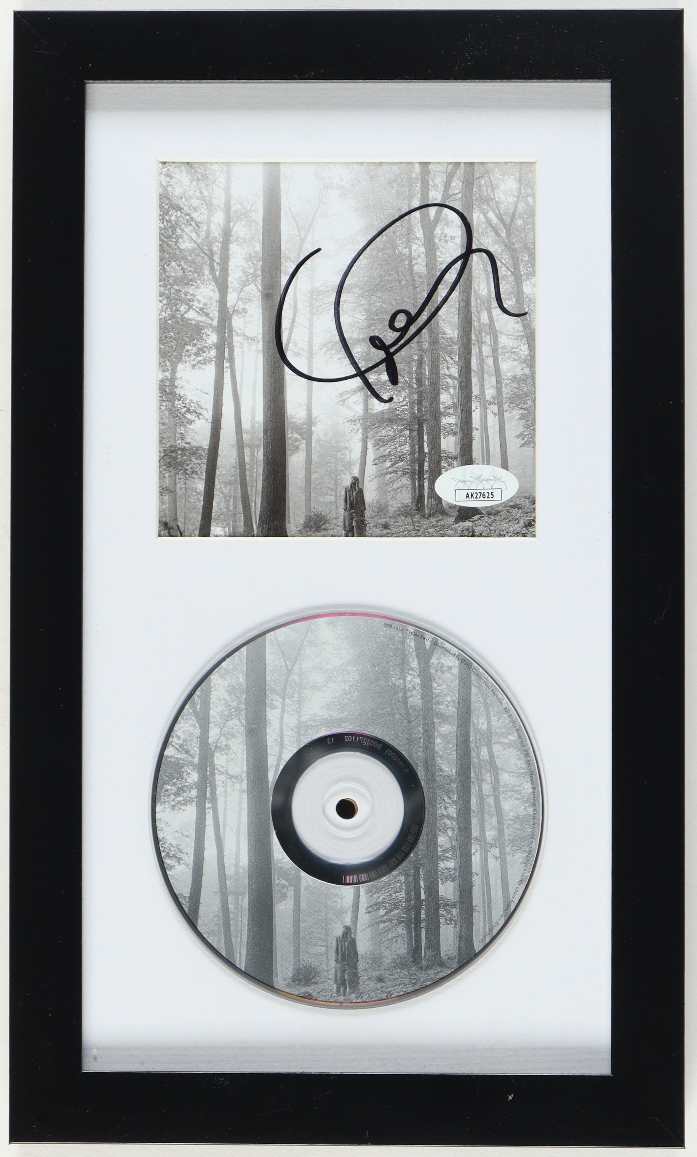 Custom frame measures approximately 8" x 13.5" in size. Features a "Folklore" CD album cover that has been hand-signed by Taylor Swift. The CD disc is included as shown. Please note, there is scuffing on the frame borders.