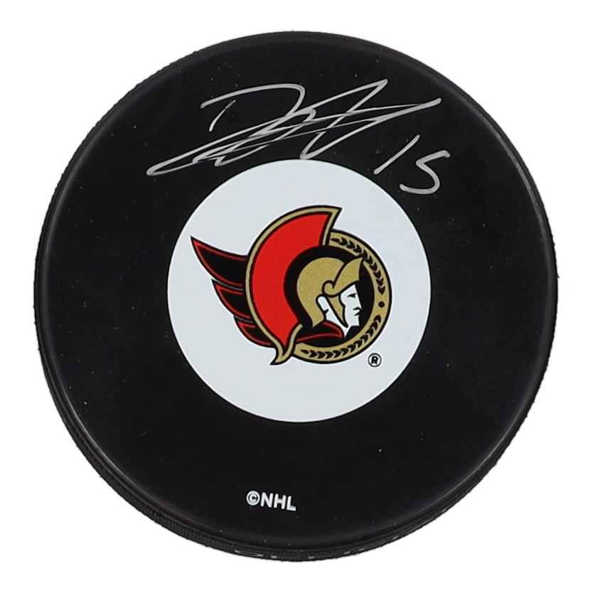 Ottawa Senators logo hockey puck has been hand-signed by Dany Heatley.