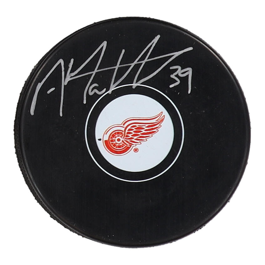 Detriot Red Wings logo hockey puck has been hand signed by Anthony Mantha.